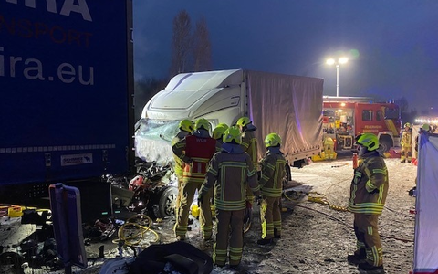 Als kurz danach die ersten Einsatzkräfte den Unfallort erreichten, trafen sie auf Ersthelfer, die dem ansprechbaren Fahrer eines polnischen Kleintransporters der Marke Renault erste Hilfe leisteten. Das Fahrerhaus war sehr stark deformiert und musste zunächst im vorderen Bereich mit hydraulischen Rettungsgeräten auseinander gedrückt werden. Während das eingeklemmte Unfallopfer vom Rettungsdienst medizinisch versorgt wurde, schnitten Feuerwehrleute die Trennwand zum Laderaum auf. Aufgrund der kompliziert eingeklemmten Beine dauerte es insgesamt etwa 90 Minuten, bis der 44-jährige Mann aus den Trümmern seines Lieferwagens befreit und von einem Notarzt begleitet mit einem Rettungswagen in ein Krankenhaus transportiert werden konnte. Der 56-jährige Fahrer des Sattelzuges blieb unverletzt. Aufgrund von ausgelaufenen Betriebsstoffen mussten Feuerwehr und Straßenmeisterei anschließend umfangreiche Aufräum- und Reinigungsarbeiten veranlassen.
