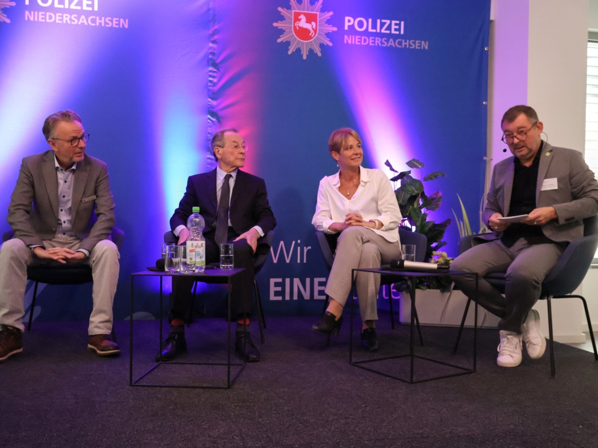 Anschließend diskutierten Franz Müntefering, der Leiter der Forschungsstelle für Polizei- und Demokratiegeschichte/des Polizeimuseums der Polizeiakademie Niedersachsen, Dr. Dirk Götting, sowie Polizeipräsidentin Gwendolin von der Osten, im Rahmen einer Talkrunde über die Auswirkungen gesellschaftlicher Dynamiken auf polizeiliches Handeln sowie über erste Impulse aus den Themenräumen.