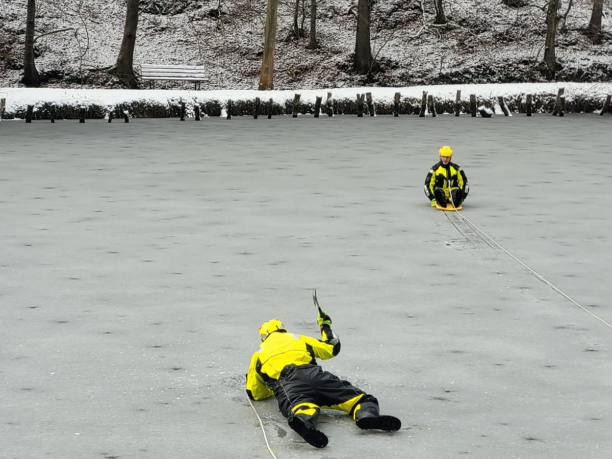 07.01.2026 - 17:24:41 | presseportal.deDiesen besonderen Umstand nahm die Löscheinheit Stadt Blankenberg der Feuerwehr Hennef zum Anlass, die Menschenrettung auf einem zugefrorenen Teich zu üben.