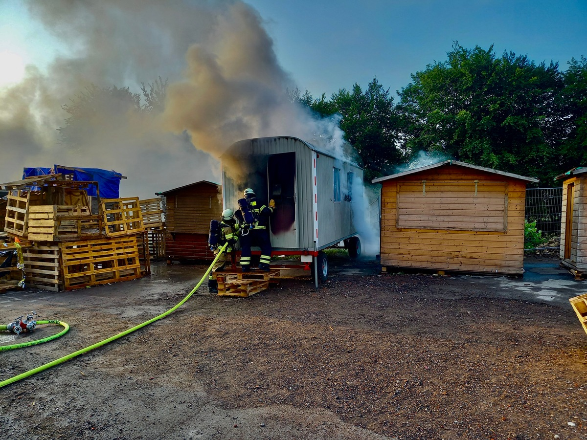 Ein brennender Bauwagen wurde der Feuerwehr dann am Sonntag um 6:47 Uhr vom Abenteuerspielplatz Am Berge gemeldet. Hier brannte ein Bauwagen, welcher offenbar als Materiallager genutzt war. Eine Brandausbreitungsgefahr bestand nicht. Der Brand war auf den metallischen Bauwagen begrenzt. Ein Trupp unter Atemschutz nahm die Brandbekämpfung auf. Glutnester im Bauwagen mussten freigelegt werden. Die Wasserversorgung wurde über das Tanklöschfahrzeug sichergestellt. Nach dem Einsatz wurde, gemäß dem neuen Hygienekonzept, die mit Brandrauch kontaminierte Schutzkleidung des Trupps abgelegt. Die Kräfte bekamen vor Ort Ersatzkleidung. Die Polizei erschien zur Brandursachenermittlung an der Einsatzstelle. Auch das Ordnungsamt war an der Einsatzstelle. Ein Löschzug war 90 Minuten vor Ort.