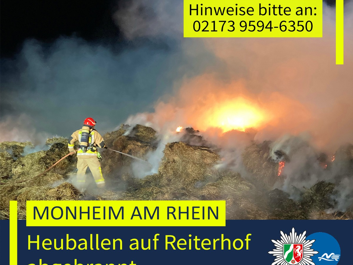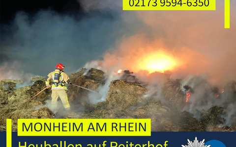 Gegen 22:45 Uhr wurden Feuerwehr und Polizei zu einem Brand auf einem Reiterhof am Heilerberg gerufen. Als die Einsatzkräfte eintrafen, standen mehrere auf einem Anhänger gelagerte Heuballen in Vollbrand. Trotz des schnellen Eingreifens der Einsatzkräfte der Feuerwehr der Stadt Monheim am Rhein konnte nicht verhindert werden, dass die Heuballen vollständig abbrannten und der Anhänger beschädigt wurde. Wie hoch der entstandene Schaden ist, ist derzeit noch unklar.