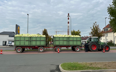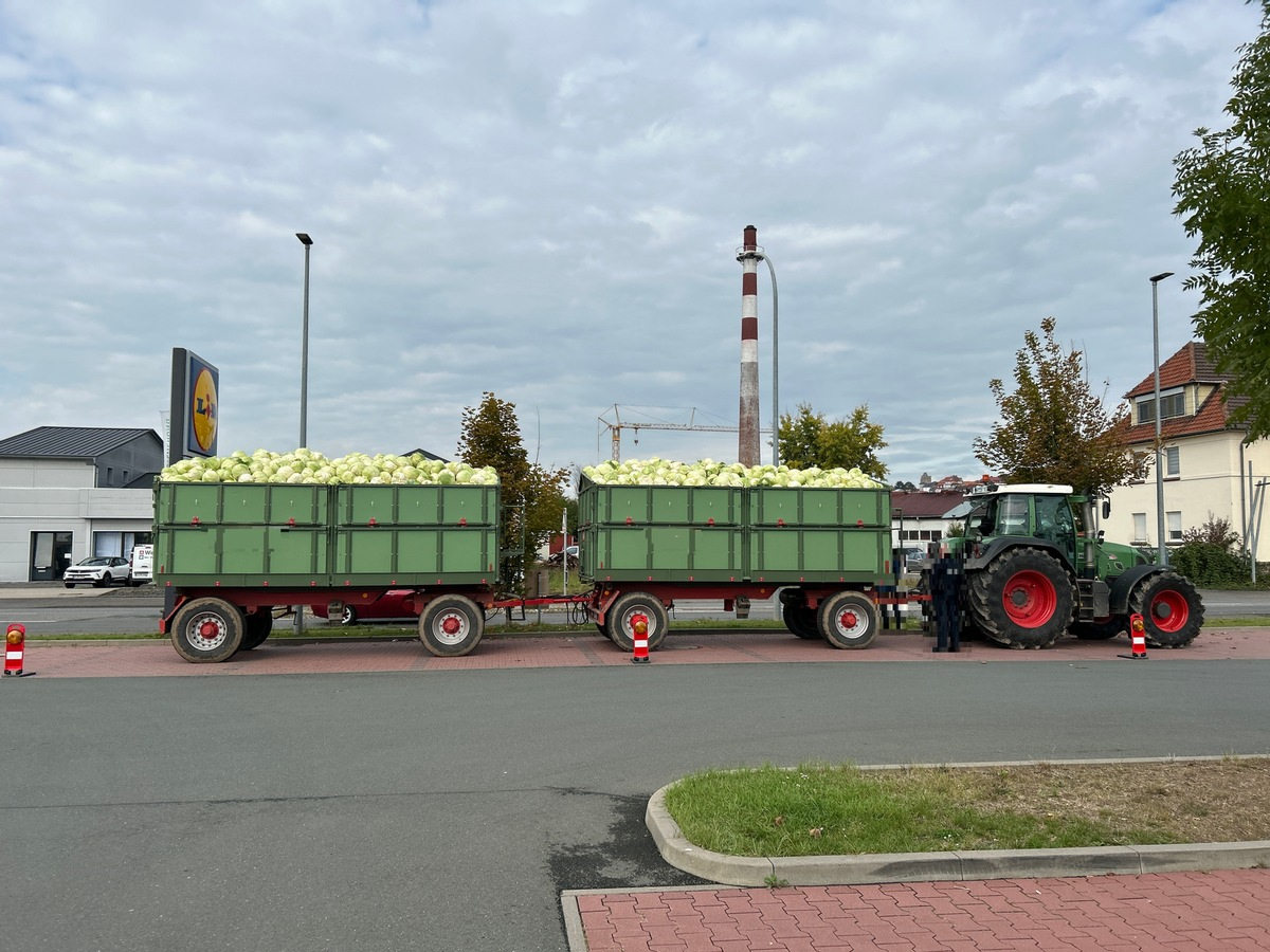 Bei insgesamt sieben kontrollierten Zugmaschinen mit elf Anhängern konnten erfreulicherweise keine gravierenden Verstöße festgestellt werden. Lediglich ein Ordnungswidrigkeitsverstoß wegen mangelhafter Ladungssicherung wurde geahndet. Ein Schlepper mit Weißkohlladung hatte seine Fracht zu hoch gestapelt, sodass diese nicht ordnungsgemäß gesichert werden konnte (Bild).
