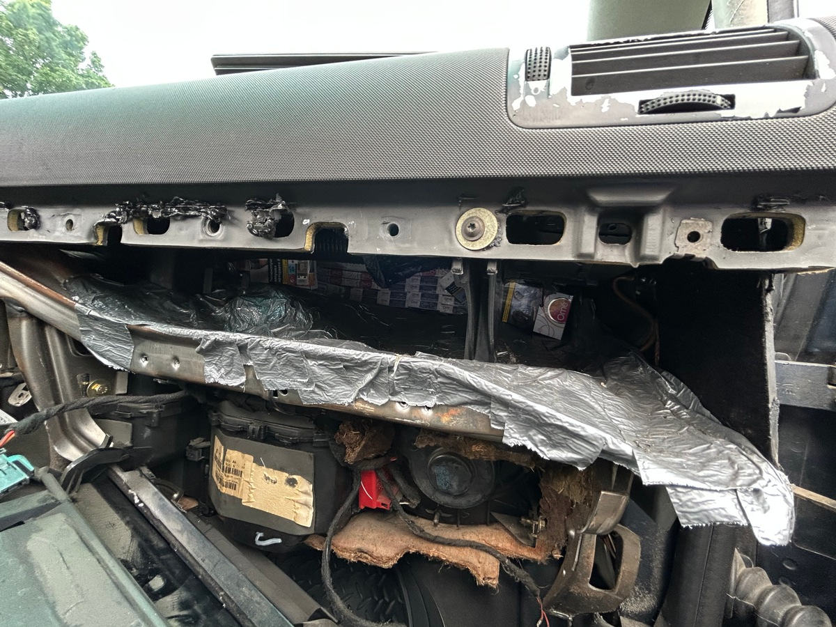 Bei der anschließenden Kontrolle fanden die Zöllner bereits auf der Fahrzeugrückbank in zwei Papiertüten 13 Stangen unversteuerte Zigaretten. In einem der beiden im Kofferraum befindlichen Reisekoffer entdeckten die Einsatzkräfte des Zolls unter Decken weitere 21 Stangen Schmuggelzigaretten. Da den Zöllnern die Innenraumverkleidungen des Fahrzeugs verdächtig vorkamen, vertieften sie die Kontrolle und fanden versteckt in einem umgebauten Hohlraum zwischen Motorraum und Armaturenbrett insgesamt zusätzliche 803 ausländische unversteuerte Schachteln Zigaretten. Auch aus der Verkleidung über dem linken Hinterreifen und weiteren bauartbedingten Hohlräumen sammelten die Zöllner weitere Zigaretten zusammen. Aus dem ebenfalls rekonstruierten Dachhimmel des Autos regnete es schließlich mehr als 20 weitere Stangen Zigaretten.