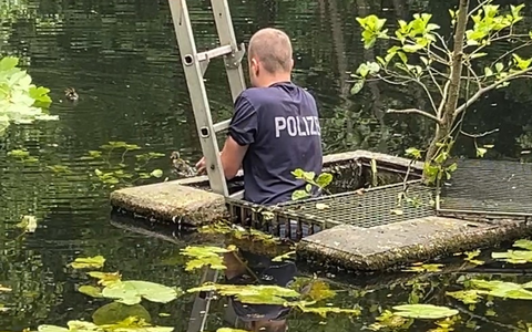 Nach Beendigung der Rettungsaktion watschelte die sichtlich gerührte Entenmama auf den jungen Kollegen zu und hauchte ihm ganz verliebt "Danke, mein Held" entgegen. Danach sprang sie zu ihren Küken ins Wasser, schwamm noch ein Herz und freute sich über die Wiedervereinigung der Familie.