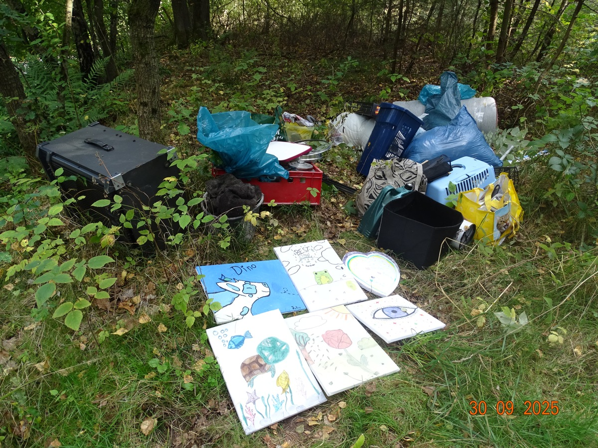 Vor Ort stellten sie diversen Hausrat, Lebensmittelabfälle, Sperrgut und einen halbvollen Kanister Motoröl fest. Darunter befanden sich auch mehrere selbst gemalte, mit Vornamen versehene Bilder, so dass die Ermittler hier auf Zeugenhinweise setzen. Der Tatzeitraum ist bislang nicht näher eingrenzbar.
