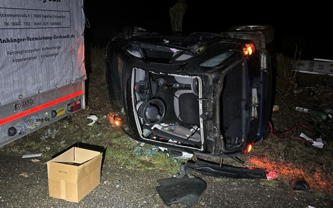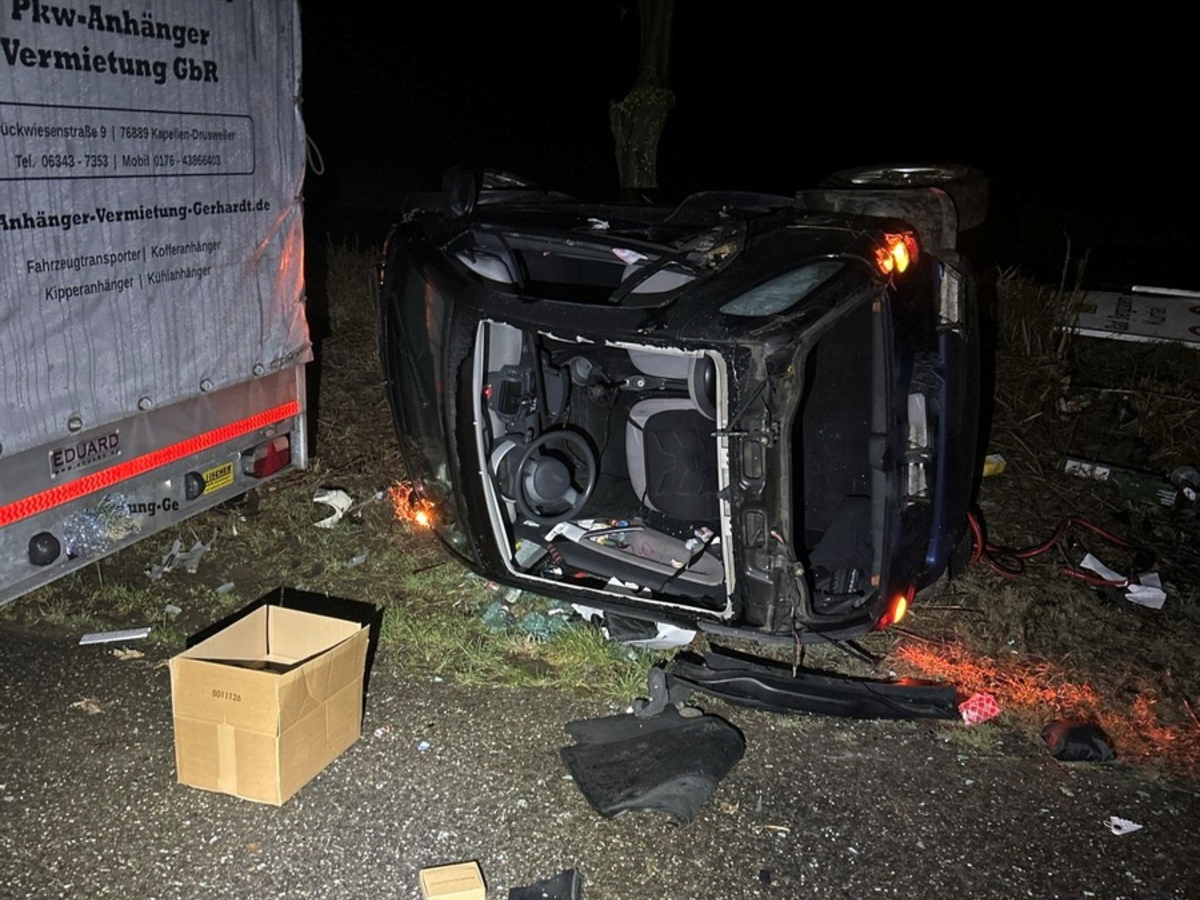 Kapellen-Drusweiler - Am frühen Mittwochmorgen befuhr um 05:25 Uhr ein 33-Jähriger mit seinem Smart die B427 von Bad Bergzabern kommend in Richtung Kapellen. Aufgrund nicht der Winterglätte angepasster Geschwindigkeit kam er nach links von der Fahrbahn ab und der Smart stürzte auf die linke Fahrzeugseite. Der Mann, welcher sich leicht an der Hand verletzte, konnte durch das beschädigte Glasdach aussteigen. Neben dem Unfallfahrzeug wurde die Plane eines nahestehenden Anhängers durch umherfliegende Glassplitter beschädigt.