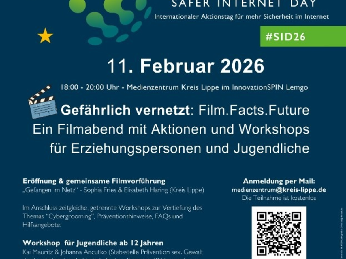 Am 11.02.2026 von 18 - 20 Uhr wird ein gemeinsamer Filmabend mit dem Medienkompetenzzentrum des Kreises Lippe im InnovationSPIN Lemgo (Campusallee 19 / Ebene 2, Raum 2_26) für Jugendliche und Eltern veranstaltet. Nach einer Eröffnung durch Sophia Fries und Elisabeth Haring (Kreis Lippe) wird der Film "Gefährlich vernetzt" zum Thema Cybergrooming gezeigt. Anschließend finden zwei Workshops dazu statt: Jugendliche ab 12 Jahren werden durch Kai Mauritz und Johanna Ancutko (Lippische Landeskirche, Prävention sex. Gewalt) sowie Torben Sprenger (Lippische Landeskirche, Bildungsreferat) betreut. Mit den Erziehungspersonen werden Arnd Begemann und Melanie Schmidt (Polizei Lippe, Kriminalprävention und Opferschutz) über den Film sprechen. Kostenlose Anmeldungen sind per Mail unter medienzentrum@kreis-lippe.de möglich.