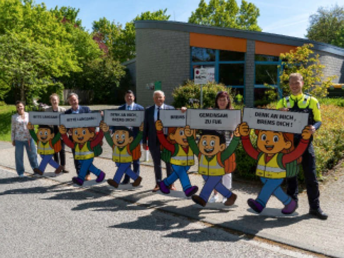Kreis Viersen - "Brems Dich!", "Pass auf!", "Denk an mich, brems Dich!" oder "Gemeinsam zu Fuß!" - mit diesen klaren Botschaften werden die neuen Verkehrshelden der Polizei Viersen künftig im gesamten Kreisgebiet auf mehr Sicherheit im Straßenverkehr aufmerksam machen. Seit Freitag sind die auffälligen Präventionsaufsteller offiziell im Einsatz. Entwickelt wurden die Verkehrshelden von den Verkehrssicherheitsberaterinnen und Verkehrssicherheitsberatern der Polizei Viersen. Dank der Unterstützung der Kreisverkehrswacht Viersen e. V. sowie der Verkehrswacht Viersen e. V. konnten insgesamt sechs neue Aufsteller realisiert werden. Sie sind einheitlich gestaltet und greifen mit unterschiedlichen Appellen die Themen Aufmerksamkeit, Rücksichtnahme und angepasste Geschwindigkeit auf. Ein besonderes Anliegen der Aktion ist zudem, Eltern dazu zu ermutigen, ihre Kinder häufiger zu Fuß zur Schule oder in den Kindergarten zu begleiten. Dadurch kann der Fahrzeugverkehr unmittelbar vor den Einrichtungen reduziert und die Verkehrssituation deutlich entschärft werden. Am Freitag wurden die Verkehrshelden im Beisein von Landrat Bennet Gielen offiziell an die Polizei übergeben. Anschließend wurden die Aufsteller gemeinsam mit dem Landrat, dem Bürgermeister der Stadt Viersen, Christoph Hopp, Vertretern der Verkehrswachten und der Polizei für ihren ersten Einsatz an der KiTa Hüsgesweg in Viersen aufgestellt. "Nun ist es wichtig, dass die Verkehrshelden auch sichtbar eingesetzt werden", betont Verkehrssicherheitsberater Tobias Stapper. Schulen, Kindergärten und weitere Einrichtungen, die Interesse an einem Einsatz der Verkehrshelden haben, können sich an ihre örtlichen Verkehrssicherheitsberaterinnen und Verkehrssicherheitsberater wenden oder per E-Mail Kontakt aufnehmen: V_VUP.Viersen@polizei.nrw.de /jk (281)