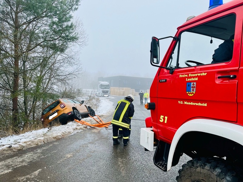 Die alarmierte Freiwillige Feuerwehr konnte den PKW mittels Seilwinde sichern und erfolgreich bergen. Am Fahrzeug entstand kein Schaden.