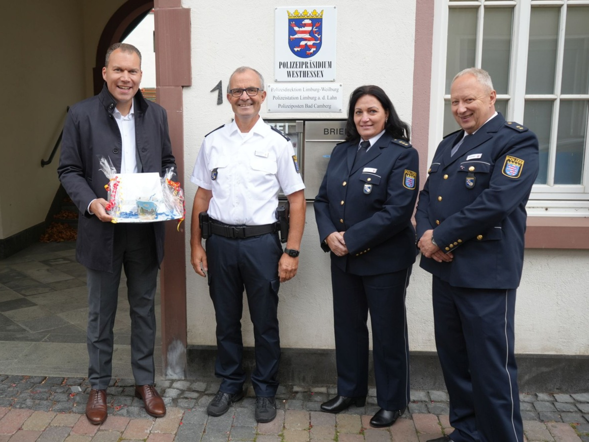 26.09.2025 - 11:18:26 | presseportal.de(wie) In Bad Camberg ist am Mittwochnachmittag der Schutzmann vor Ort in sein Amt eingeführt worden. Um 14 Uhr trafen sich Polizeidirektorin Mona Mai, Polizeioberrat Martin Schlögl und Bürgermeister Daniel Rühl am Polizeiposten in Bad Camberg, um dort gemeinsam den Schutzmann vor Ort (SvO) Klaus Pörtner offiziell in sein Amt einzuführen. Sowohl der Bürgermeister als auch die Polizeidirektionsleiterin brachten ihre Freude über die neu geschaffene Position in der Stadt zum Ausdruck. "Mit Polizeioberkommissar Pörtner erhält Bad Camberg einen erfahrenen kompetenten und bürgernahen Schutzmann, der sich deutlich sichtbar im Stadtbild zeigen wird." sagte der Leiter der Polizeistation Limburg, Martin Schlögl, der dadurch auch Chef des Polizeipostens Bad Camberg ist. Bei Fuß- oder Fahrradstreifen wird der neue SvO den Bürgerinnen und Bürgern stets begegnen und immer ansprechbar sein. Mit einem offenen Ohr für die Anliegen aller soll der Beamte Präventionsangebote bekannt machen, vernetzen und der persönlich bekannte Ansprechpartner der Polizei sein. Auch auf vielen Veranstaltungen der Stadt und in den Stadtteilen wird Herr Pörtner präsent sein. Bürgermeister Rühl ist sich sicher, dass "unser Schutzmann vor Ort zu einer weiteren Verbesserung der Sicherheit und des Sicherheitsgefühls in Bad Camberg beitragen wird". Klaus Pörtner ist unter der Rufnummer 06434/ 905467-13 zu erreichen.