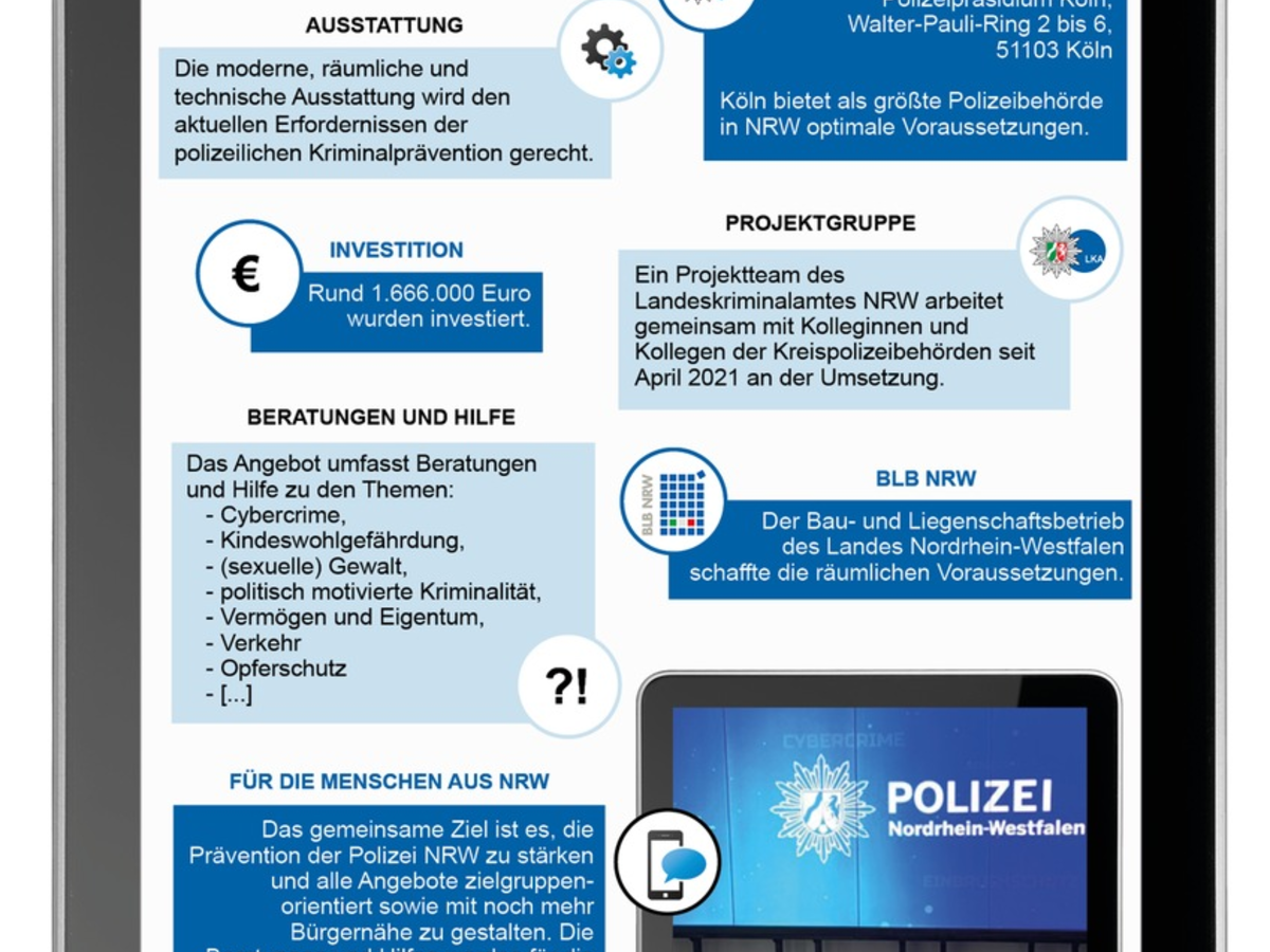 In dem Digitalen Beratungs- und Präventionszentrum der Polizei NRW in Köln informieren und sensibilisieren geschulte Mitarbeiterinnen und Mitarbeiter über verschiedene Themen. Das Beratungs- und Hilfsangebot erstreckt sich von Aufklärung zu Delikten aus den Bereichen Cybercrime, Kindeswohlgefährdung und Jugendkriminalität, (sexuelle) Gewalt, politisch motivierte Kriminalität sowie Vermögen und Eigentum bis hin zum polizeilichen Opferschutz. Darüber hinaus ist das neue Zentrum eine Plattform, um mit Kooperationspartnern zusammenzuarbeiten und Maßnahmen im Zusammenhang mit den Landeskampagnen "Riegel vor! Sicher ist sicherer!", "Sicher im Alter", "Augen auf - Tasche zu" und "Mach Dein Passwort stark" umzusetzen.