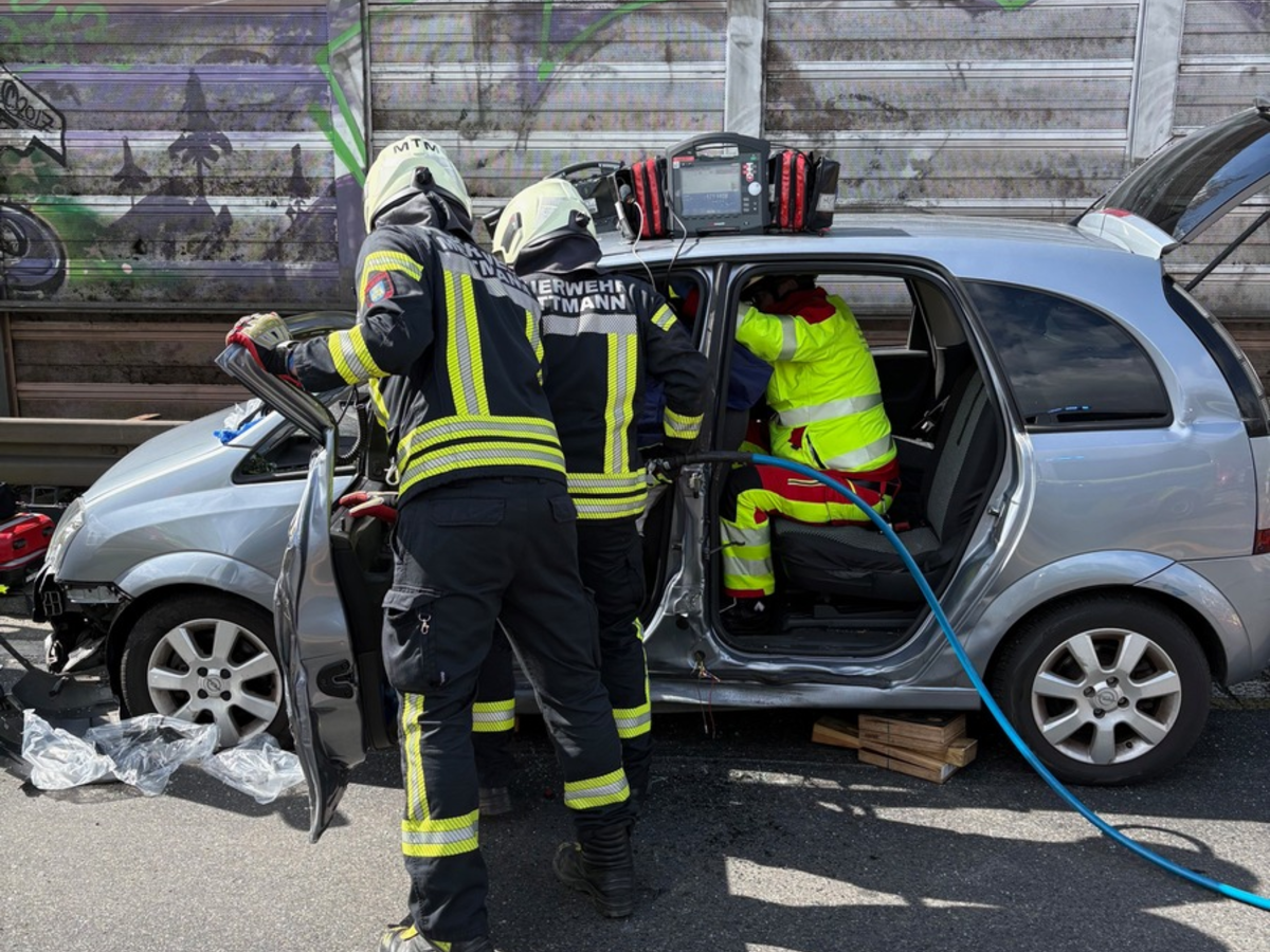 Mettmann - am Montag den 30.03.26 um 12:52 wurden die Feuerwehr und der Rettungsdienst der Stadt Mettmann auf die BAB3 in Fahrtrichtung Köln zu einem Verkehrsunfall zwischen einem PKW und einem LKW alarmiert. An der Einsatzstelle trafen die Einsatzkräfte auf einen stark beschädigten Opel in dem 2 leicht verletzte Patientinnen eingeschlossen waren. Da sich die Türen des PKW nicht öffnen ließen, nahm die Feuerwehr technisches Gerät vor um einen Zugang zu den Patientinnen zu schaffen. Diese wurden durch den Rettungsdienst im Fahrzeug erstversorgt und anschließend mit Hilfe der Feuerwehr schonend aus dem Fahrzeug gehoben. Beide Patientinnen wurden mit Rettungswagen umliegenden Krankenhäusern zugeführt. Der Einsatz war nach ca. einer Stunde beendet. Unterstützt wurde die Feuerwehr Mettmann durch den Notarzt des Kreises Mettmann sowie die Autobahnpolizei Düsseldorf.