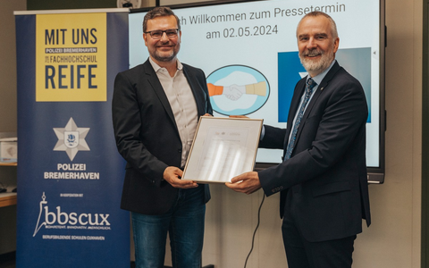 Bremerhaven - Die Bremerhavener Polizei ist am heutigen Donnerstag, 2. Mai, eine Kooperation mit den Berufsbildenden Schulen (BBS) Cuxhaven eingegangen. Ziel ist es, den Schülerinnen und Schülern der BBS über ein Langzeitpraktikum bei der Polizei Bremerhaven zur Fachhochschulreife zu verhelfen. Der Direktor der Ortspolizeibehörde, Volker Ortgies, und der Leiter der BBS, Carsten Hoppe, unterzeichneten in Cuxhaven eine entsprechende Vereinbarung. Die Schülerinnen und Schüler mit der Fachrichtung Wirtschaft und Verwaltung der BBS können sich damit ab sofort für einen entsprechenden Praktikumsplatz bei der Polizei bewerben. Haben sie die Zusage in der Tasche, kann der für die Erlangung der Fachhochschulreife erforderliche praktische Teil bei der Bremerhavener Polizei absolviert werden. Der Praktikumszeitraum erstreckt sich für die Teilnehmenden des Kooperationsprojektes über jeweils ein Schuljahr. Dabei werden sie in unterschiedlichen Abteilungen eingesetzt, können Sportangebote und Ausbildungsinhalte der Beamtinnen und Beamten nutzen und sich Einblicke in das Auswahlverfahren für die künftigen Polizeistudierenden verschaffen. So haben sie die Chance, das Arbeiten bei der Polizei in Bremerhaven umfassend kennenzulernen, um so festzustellen, ob ein Polizeistudium eine Möglichkeit für die eigene berufliche Entwicklung ist. Denn mit der Fachhochschulreife steht den Teilnehmenden die Möglichkeit offen, sich für ein Studium bei der Hochschule für Öffentliche Verwaltung im Land Bremen zu bewerben und so ihre Karriere bei der Polizei Bremerhaven zu starten. Volker Ortgies, Direktor der Ortspolizeibehörde Bremerhaven, freut sich über die Kooperation. "Wir gehen fest davon aus, dass das der Beginn einer guten Zusammenarbeit ist.", sagte Volker Ortgies heute in Cuxhaven. Starten wird das Projekt noch in diesem Sommer mit dem ersten Praktikumsumlauf. Zusätzlich zur Kooperation mit den BBS Cuxhaven plant die Ortspolizeibehörde auch mit den Kaufmännischen Lehranstalten Bremerhaven ein entsprechendes Praktikumsprojekt. Hierzu wird es noch eine gesonderte Pressemitteilung geben.