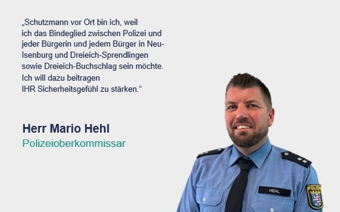 Mario Hehl ist 46 Jahre alt, verheiratet und Vater zweier Kinder. Zuvor war er gut 20 Jahre bei der Polizeistation Langen tätig. In seiner Funktion als neuer Schutzmann vor Ort kümmert er sich unter anderem um die Anliegen der Bürgerinnen und Bürger von Neu-Isenburg und der beiden Stadtteile Zeppelinheim und Gravenbruch.