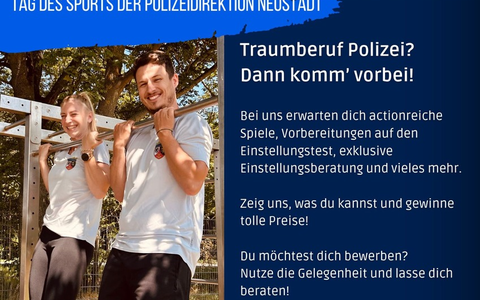 Die Polizeidirektion Neustadt lädt alle Interessierten ab 14 Jahren herzlich zum Sporttag ein. Vor Ort könnt ihr gemeinsam mit unseren Polizeikolleginnen und -kollegen die sportlichen Disziplinen des Auswahlverfahrens kennenlernen - und natürlich auch selbst ausprobieren. Neben dem sportlichen Programm steht euch unser Team der Einstellungsberatung für alle Fragen rund um den Polizeiberuf und den Bewerbungsprozess zur Verfügung. Ob Voraussetzungen, Karrierewege oder Tipps für eine erfolgreiche Bewerbung - wir informieren euch umfassend.