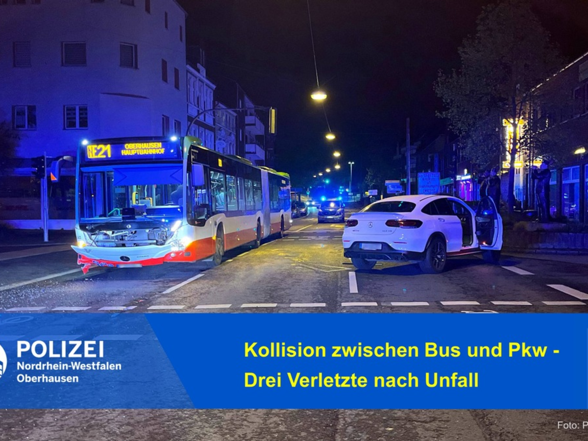 16.04.2025 - 08:45:09 | presseportal.deNach ersten Erkenntnissen ist davon auszugehen, dass zum Zeitpunkt des Unfalls der am Unfall beteiligte Busfahrer (23) die Bottroper Straße in Fahrtrichtung Werthfeldstraße befuhr. Zeitgleich beabsichtigte ein 19-jähriger Mercedes-Fahrer, von der Gildenstraße aus auf die Bottroper Straße einzubiegen. Während des Einbiegens kam es dann im Kreuzungsbereich zur Kollision, bei welcher der Bus den Pkw an der linken Fahrzeugseite rammte. Durch den Zusammenstoß wurden der 19-jährige Pkw-Fahrer sowie zwei Fahrgäste des Busses leicht verletzt. Die Verletzungen wurden durch eine Rettungswagenbesatzung behandelt, die einen der Verletzten in ein Krankenhaus brachte.
