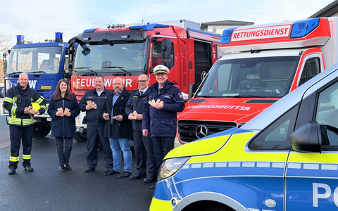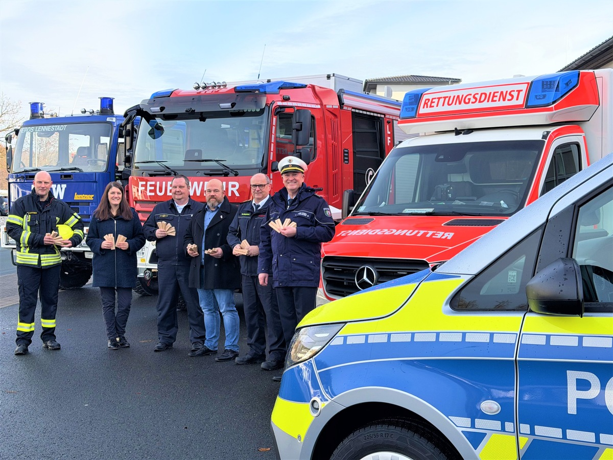 Am Donnerstag, 27. November 2025, übergab das landesweite Präventionsnetzwerk #sicherimDienst der Kreispolizeibehörde Olpe, der Freiwilligen Feuerwehr Olpe, dem Rettungsdienst des Kreises Olpe und dem Technischen Hilfswerk (THW) offiziell speziell gefertigte Türkeile aus Holz. Sie dienen der Eigensicherung im Einsatz und werden künftig in den beteiligten Organisationen genutzt. Die Übergabe im Kreis Olpe erfolgte exemplarisch für die gute Zusammenarbeit der Einsatz- und Rettungskräfte vor Ort. Der Türkeil ist als praxistaugliches Präventionsmittel konzipiert und trägt das Logo sowie einen QR-Code des Netzwerks #sicherimDienst, über den sich Nutzerinnen und Nutzer direkt über Angebote des Gewaltschutzes informieren können. "Eigensicherung muss unkompliziert und im Alltag sofort nutzbar sein. Genau dafür steht dieses kleine, aber wirkungsvolle Hilfsmittel", erläutert Anne Herr von der Stabsstelle des Präventionsnetzwerks. "Es ist sehr gut, dass nun nicht nur unsere eigenen Mitarbeitenden, sondern Feuerwehr, Rettungsdienst und das Technische Hilfswerk ebenfalls mit den kleinen Sicherheitshelfern ausgestattet sind. So ziehen wir auch im Punkt Eigensicherung an einem Strang", freut sich Ralf Kluxen, Abteilungsleiter der Kreispolizeibehörde Olpe.