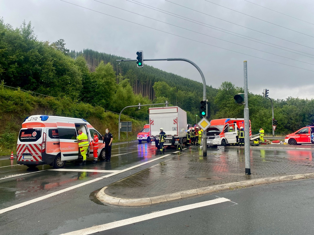 Olsberg - Zu einem schweren Verkehrsunfall auf der B480 (Ortsumgehung) am Losenbergtunnel in Olsberg - Bigge wurden in der Mittagszeit gegen 12:20 Uhr der Löschzug Bigge Olsberg zusammen mit dem Rettungsdienst, Notarzt und der Polizei alarmiert. Im Kreuzungsbereich vor dem Tunnel war es zum Zusammenstoß zwischen einem Rettungswagen und einem LKW gekommen. Durch den Aufprall wurde ein 32-jähriger Mitarbeiter des Rettungsdienstes im hinteren Patientenraum eingeklemmt. Er musste mit hydraulischem Rettungsgerät von den Kräften des Löschzuges befreit werden. Er wurde, wie der 27-jährige Kollege, sowie eine 21-jährige Kollegin nur leicht verletzt. Auch der 46-jährige LKW-Fahrer zog sich nur leichte Verletzungen zu. Ein Patient befand sich zum Zeitpunkt des Unfalls nicht im Rettungswagen. Das Fahrzeug war ohne Sonderrechte auf dem Weg zurück zur Rettungswache. Alle 4 Unfallbeteiligten wurden mit Rettungswagen in umliegende Krankenhäuser transportiert. Die Besatzung eines zufällig an der Unfallstelle vorbeifahrenden Krankenwagens der Johanniter aus dem Kreis Korbach unterstützte bei der Erstversorgung der Verletzten. Vom Zentrum für Feuerschutz und Rettungswesen waren Aufgrund der Meldung ein Einsatzleitwagen, ein GW-Logistik 1 sowie der Abrollbehälter AB-Rüst mit vor Ort. Der Löschzug Bigge Olsberg, der mit 4 Fahrzeugen und 26 Kräften vor Ort war, legte noch beide Fahrzeuge stromlos, stellte den Brandschutz sicher und unterstützte die Abschleppunternehmen bei den Aufräumarbeiten. Einsatzende war für die Feuerwehr um 14:45 Uhr. Über die Unfallursache liegen der Feuerwehr keine Informationen vor, sie sind Gegenstand der polizeilichen Ermittlungen. Die B480 war während der Rettungsarbeiten voll gesperrt.