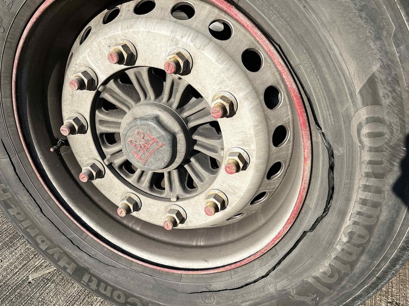 Bei einem Sattelauflieger mit türkischer Zulassung war an einem Rad der seitliche Reifenmantel vollständig aufgerissen. Aufgrund der erheblichen Gefährdung für den Straßenverkehr wurde die Weiterfahrt untersagt und eine Ordnungswidrigkeitenanzeige gefertigt. Der Fahrer zahlte vor Ort eine Sicherheitsleistung in Höhe von 210 Euro.