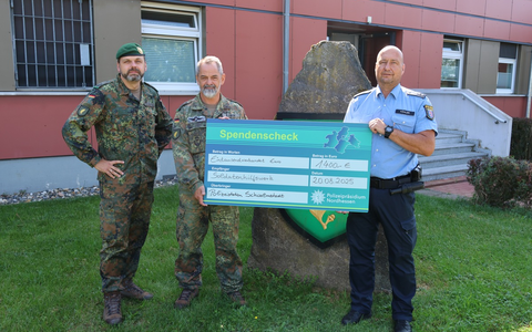 Die Übergabe an die Tiernothilfe fand am 20.08.2025, um 10:00 Uhr, auf dem Gelände der Polizeistation statt (Bild). Dazu begrüßten PHK Marco Köhler und PK Johannes Müller Frau Petra Ziegert-Postleb und Frau Sabine Ascher von der Tiernothilfe, die den symbolischen Scheck mit großer Dankbarkeit entgegennahmen. Im Anschluss, um 11:30 Uhr, erfolgte die Spendenübergabe an das Soldatenhilfswerk (Bild). PHK Marco Köhler überreichte in der Knüllkaserne einen Scheck an Oberstleutnant Sebastian Hagen, Kommandeur des Jägerbataillon 1 und an Stabsfeldwebel Thomas Kuder. Beide zeigten sich sehr erfreut über die Unterstützung und bedankten sich herzlich im Namen aller Kameradinnen und Kameraden.