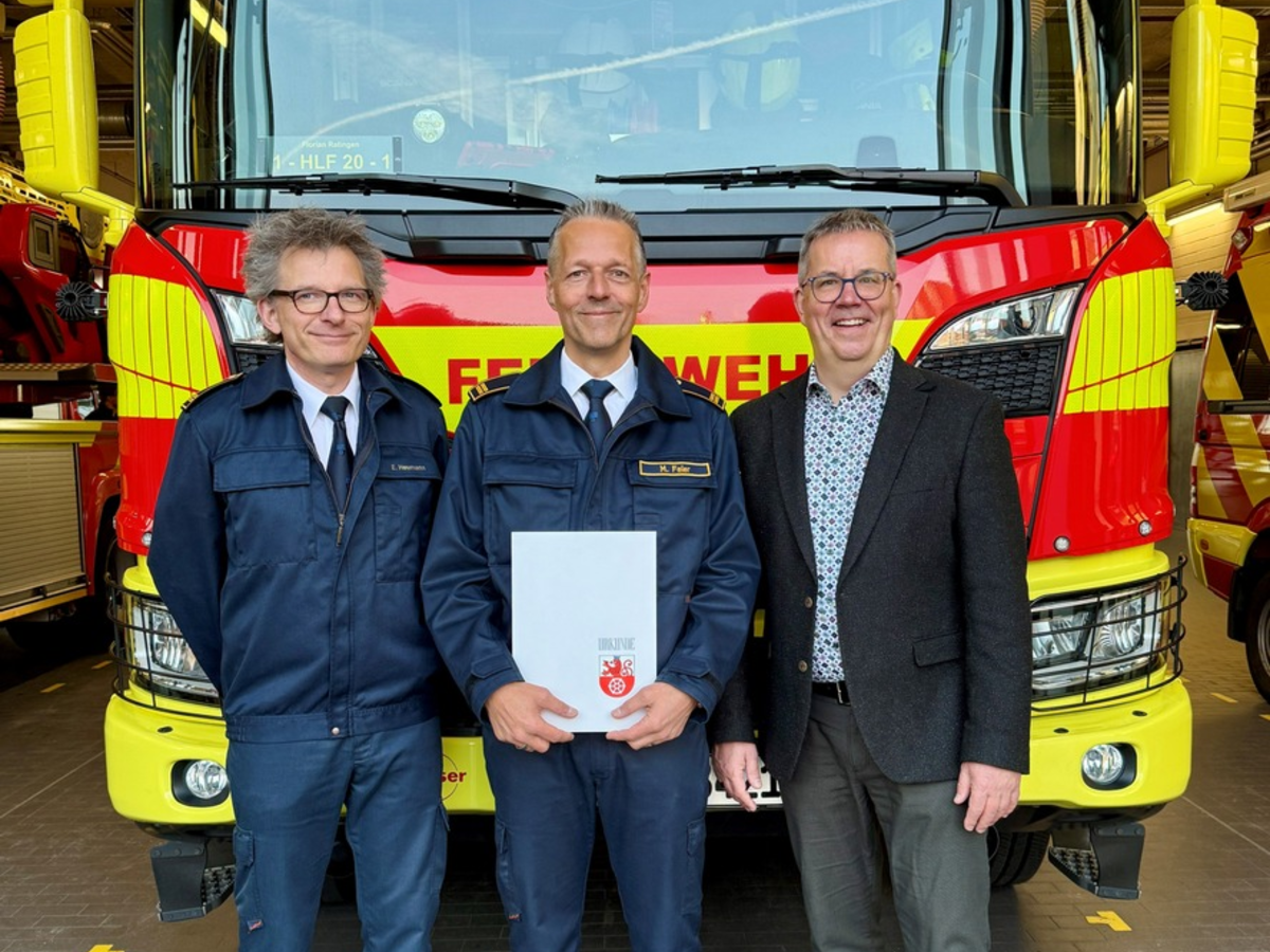 Ratingen - Markus Feier, seit September 2024 Amtsleiter der Feuerwehr Ratingen, wurde nun offiziell zum Branddirektor befördert. Die Beförderung wurde vom für die Feuerwehr zuständigen Dezernenten Harald Filip vorgenommen. Die Feuerwehr Ratingen freut sich, mit ihm eine empathische und zugleich fachlich versierte Führungspersönlichkeit an ihrer Spitze zu haben. Markus Feier gilt als starker Impulsgeber, der die Feuerwehr Ratingen zukunftsorientiert weiterentwickeln wird. Unter seiner Führung sollen sowohl die Einsatzbereitschaft und Sicherheit kontinuierlich verbessert als auch die Zusammenarbeit innerhalb der Mannschaft sowie mit der Bevölkerung nachhaltig gestärkt werden. Die Beförderung steht für Kontinuität und Fortschritt in der strategischen Führung der Feuerwehr Ratingen.