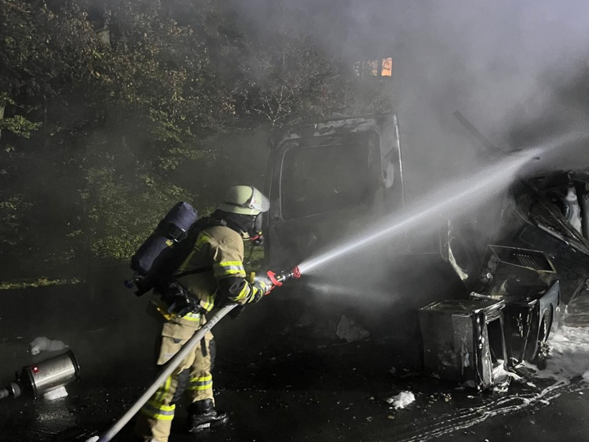 Remscheid - Um 3:18 Uhr wurde die Feuerwehr Remscheid zu einem brennenden LKW in die Rosenhügeler Straße alarmiert. Bei Eintreffen der Einsatzkräfte stand ein, am Fahrbahnrand abgestellter, LKW im Vollbrand. Es wurde umgehend eine Brandbekämpfung mit zwei Hohlstrahlrohren und einem Schaumrohr eingeleitet. Durch das Brandereignis kam es zu einem Austritt von Betriebsstoffen aus dem LKW, welche sich in das Kanalsystem ausbreiteten. In Absprache mit dem Umweltamt der Stadt Remscheid und den Technischen Betrieben Remscheid wurden Ölsperren in einem nahegelegenen Regenrückhaltebecken eingebracht. Es wurde eine Spezialfirma angefordert, um die Betriebsstoffe aus dem Regenrückhaltebecken zu entfernen und die Fahrbahn an der Einsatzstelle zu reinigen. Bis zum Abschluss der Maßnahmen bleibt die Rosenhügeler Straße, ab der Einmündung Feilenhauerweg, in beide Richtungen gesperrt. Während der Einsatzmaßnahmen wurde die Hauptfeuerwache durch die Löscheinheit Lennep besetzt.