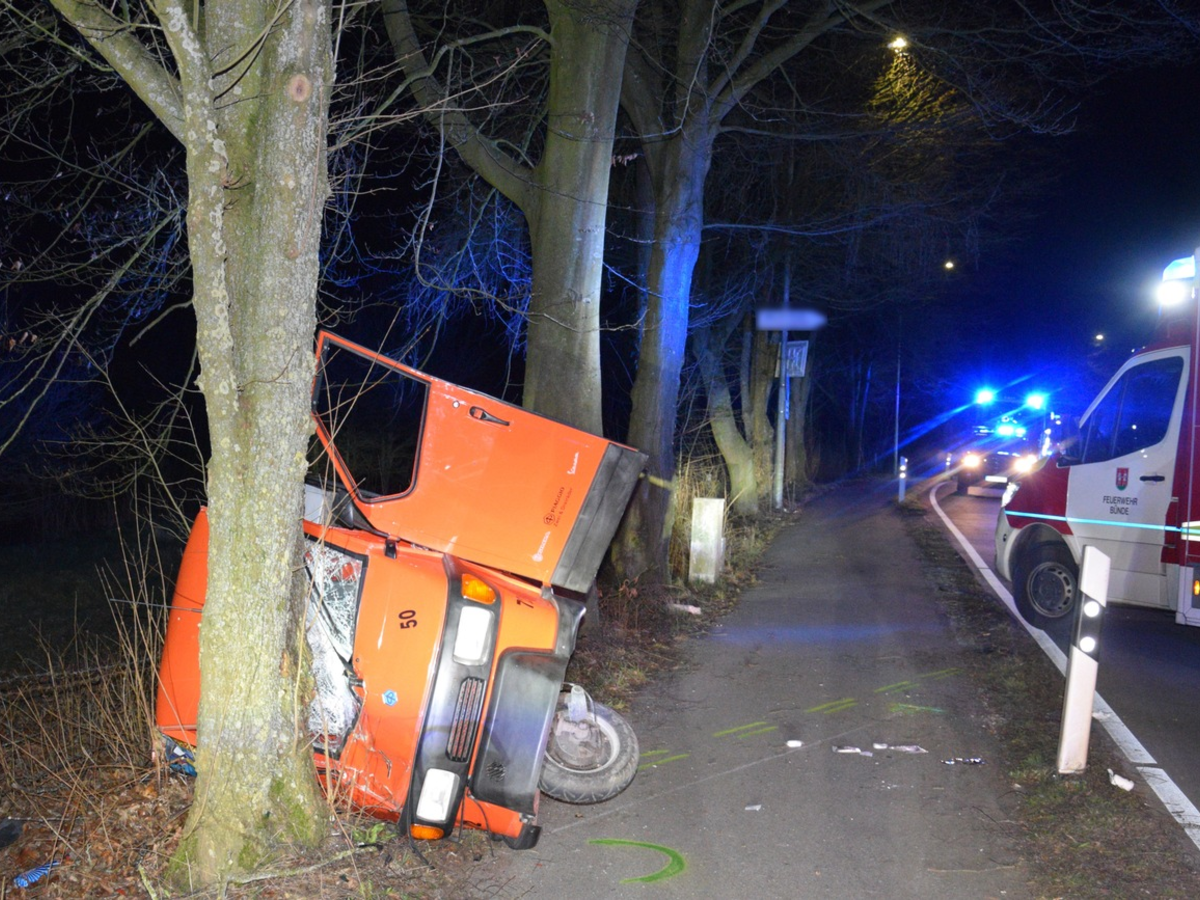 Rödinghausen - (jd) Am Sonntag (13.4.) fuhr ein 32-jähriger Mann aus Kirchlengern gegen 20.19 Uhr mit seinem Fiat auf der Osnabrücker Straße in Richtung Bünde. Aus bislang noch nicht geklärter Ursache verlor er die Kontrolle über sein Fahrzeug und geriet nach links über die Gegenfahrbahn in einen Graben. Dort prallte das Auto frontal gegen zwei Bäume. Bei dem Unfall wurde der 32-Jährige schwer verletzt. Ersthelfer kümmerten sich bis zum Eintreffen des hinzugerufenen Rettungsdienstes um den Mann, der zur weiteren Behandlung in ein Krankenhaus gebracht wurde. Das Verkehrskommissariat der Polizei Herford hat die Ermittlungen zum Unfallhergang übernommen. Für die Dauer der Unfallaufnahme wurde die Osnabrücker Straße gesperrt. Der Sachschaden liegt bei rund 3.000 Euro.
