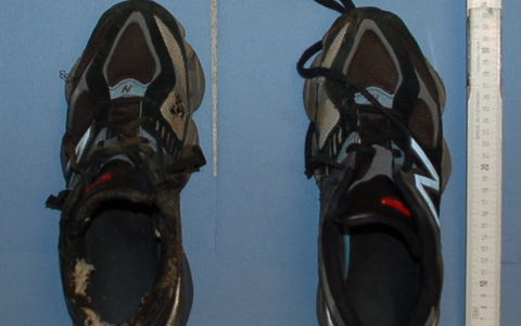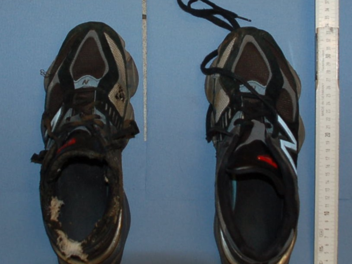 Bekleidung: grauer Pullover, weiße Weste, blaue Jeans, schwarze Unterwäsche der Marke Camel, schwarze Turnschuhe der Marke NB (New Balance) in Größe 45, silberne Uhr am linken Handgelenk