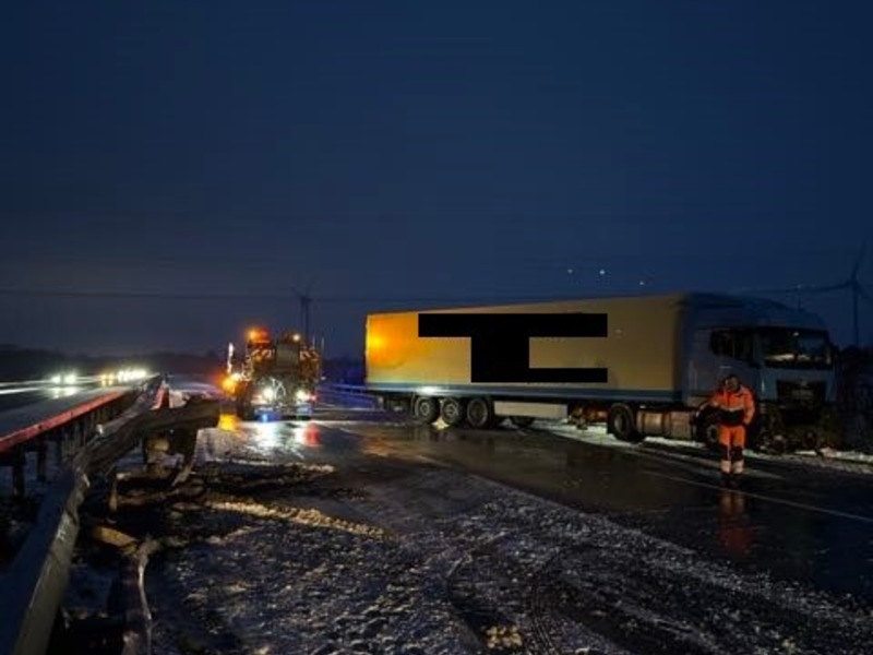 Kurze Zeit später, gegen 04:50 Uhr, ereignete sich auf derselben Strecke, rund 500 Meter hinter der ersten Unfallstelle, ein weiterer Verkehrsunfall. Ein 51-jähriger Mann verlor mit seinem Sattelzug ebenfalls auf glatter Fahrbahn die Kontrolle über das Fahrzeug. Der Sattelzug geriet ins Schleudern, prallte gegen die Mittelschutzplanke und kam anschließend quer auf der Fahrbahn zum Stehen. Der Fahrer zog sich leichte Verletzungen zu und wurde vor Ort rettungsdienstlich versorgt. Auch hier ist die Schadenshöhe noch Teil der laufenden Ermittlungen.