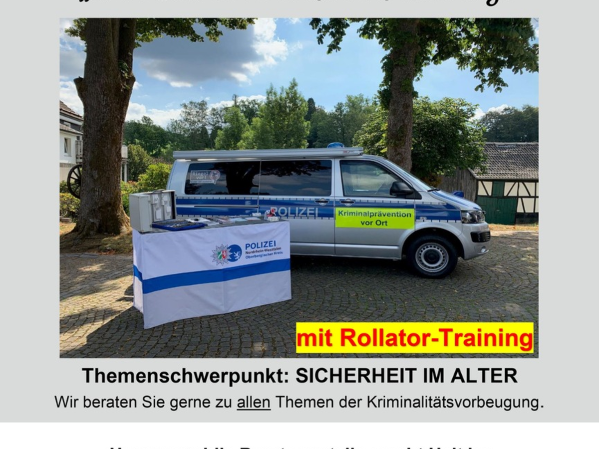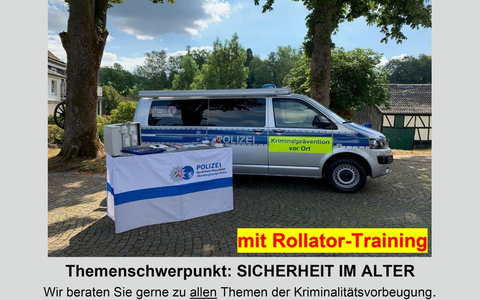In Kooperation mit der Senioren- und Pflegeberatung der Gemeinde Lindlar, die ebenfalls mit ihrem Beratungsangebot vor Ort ist, geht es um die Themen Pflege und Sicherheit im Alter. Dabei beschränkt sich das Angebot der Polizei nicht nur auf eine Beratung zu verschiedenen Aspekten der Verkehrsunfall- und Kriminalprävention. Die Polizei bringt zusätzlich ihren Rollator-Trainingsparcours mit. Unter Anleitung speziell geschulter Polizistinnen und Polizisten kann hier der sichere Umgang mit dem Rollator geübt werden. Typische Stolperfallen wie Bordsteinkanten, wackelige Gehwegplatten oder Gullideckel stellen dann kein Problem mehr da. Zusätzlich überprüft die Polizei den technischen Zustand und hilft bei der optimalen Einstellung der Rollatoren.