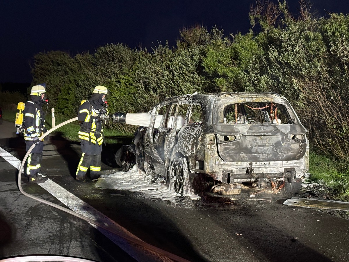 25.04.2025 - 08:03:41 | presseportal.deAls die Feuerwehr Sittensen an der Einsatzstelle eintraf, brannte das Fahrzeug bereits in voller Ausdehnung. Umgehend gingen mehrere Trupps unter Atemschutz gegen die Flammen vor. Nachdem das Feuer weitestgehend runter gelöscht war, wurde Löschschaum eingesetzt, um auch letzte Glutnester zu ersticken. Parallel musste immer wieder das Wrack mit der Wärmebildkamera kontrolliert werden. Glücklicherweise wurde niemand bei dem Brand verletzt.