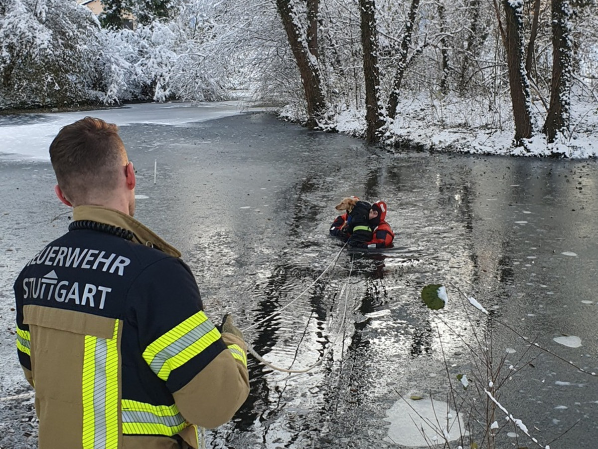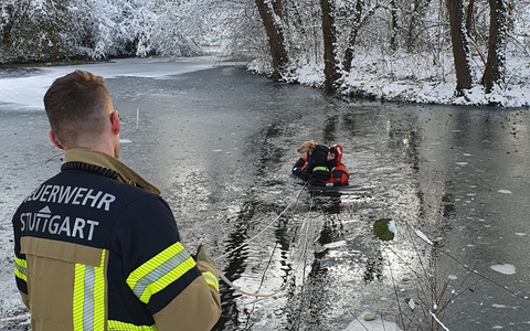 FW Stuttgart: Tierrettung Riedsee - Hund in Eisfläche eingebrochen