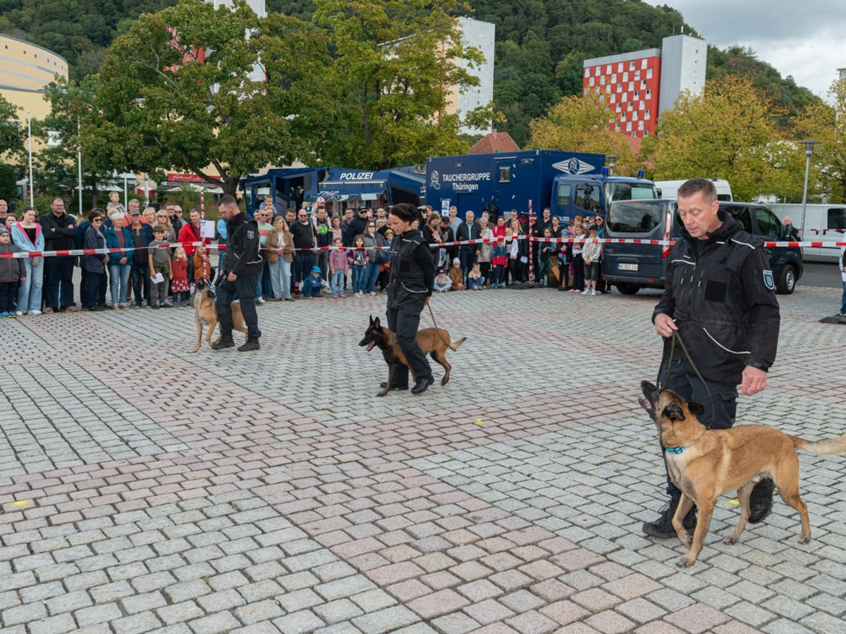 Suhl - Lachende Kinderaugen, strahlende Gesichter, Begeisterung für die Polizei - all das konnte man am 13.09.2025 beim Tag der "Polizei in Südthüringen" auf dem Platz der Deutschen Einheit in Suhl sehen. Vom historischen bis zum modernen Streifenwagen, dem Polizeimotorrad, der Diensthundestaffel, der Technischen Verkehrsüberwachung, der Kriminalpolizei bis hin zur Tauchergruppe, den Polizeidrohnen, dem taktischen Lautsprechertrupp, dem Wasserwerfer bis hin zur Kontrollgruppe für gewerblichen Güterverkehr der Autobahnpolizei - es war so ziemlich alles vertreten, was blau-silbern unterwegs ist. Es war ein Fest zum ausprobieren und sich austesten. Einmal am eigenen Körper spüren, wie schwer so eine Schutzausrüstungm in einer geschlossenen Einheit ist, sehen, wie weit oben man sitzt, wenn man den Wasserwerfer steuert oder hören, was für Regeln es für die schwergewischtigen Fahrzeuge auf Deutschlands Autobahnen gibt. Viele Fragen wurden gestellt und Stickerkarten ausgefüllt. Unzählig viele der Kleinsten haben sich auf ihren Bobbycars blitzen lassen, die Mittleren haben ihr Talent auf dem Fahrradparcours oder an der Kletterwand unter Beweis gestellt und alle haben über die eigene Zucht der Polizeipferde gestaunt. Mit einem abwechslungsreichen Kinderprogramm und einer ansprechenden Ausstellung für Jung und Alt kam jeder auf seiner Kosten. Ein Fest für die Bürgerinnen und Bürger und eine Freude für uns als Polizei, Sie an diesem Tag über unseren so vielseitigen Beruf aufzuklären zu dürfen. Wir bedanken uns ausdrücklich für Ihre Teilnahme, die netten Gespräche und die vielen lachenden Gesichter.