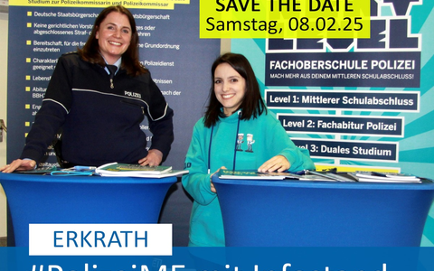 Wie wird man Polizistin oder Polizist? Welche Voraussetzungen muss man erfüllen? Was hat es mit dem neuen Studiengang für die Verwendung bei der Kriminalpolizei auf sich? Was erwartet einen während der dualen Studiengänge oder während des zweijährigen Bildungsgangs "Next Level"? Polizeihauptkommissarin Nicole Rehmann und Regierungsbeschäftigte Jennifer Sá Galante Baasch beantworten alle Fragen von 10:30 Uhr bis 13:30 Uhr persönlich an ihrem Infostand in der Stadthalle Erkrath, Neanderstraße 58, 40699 Erkrath.