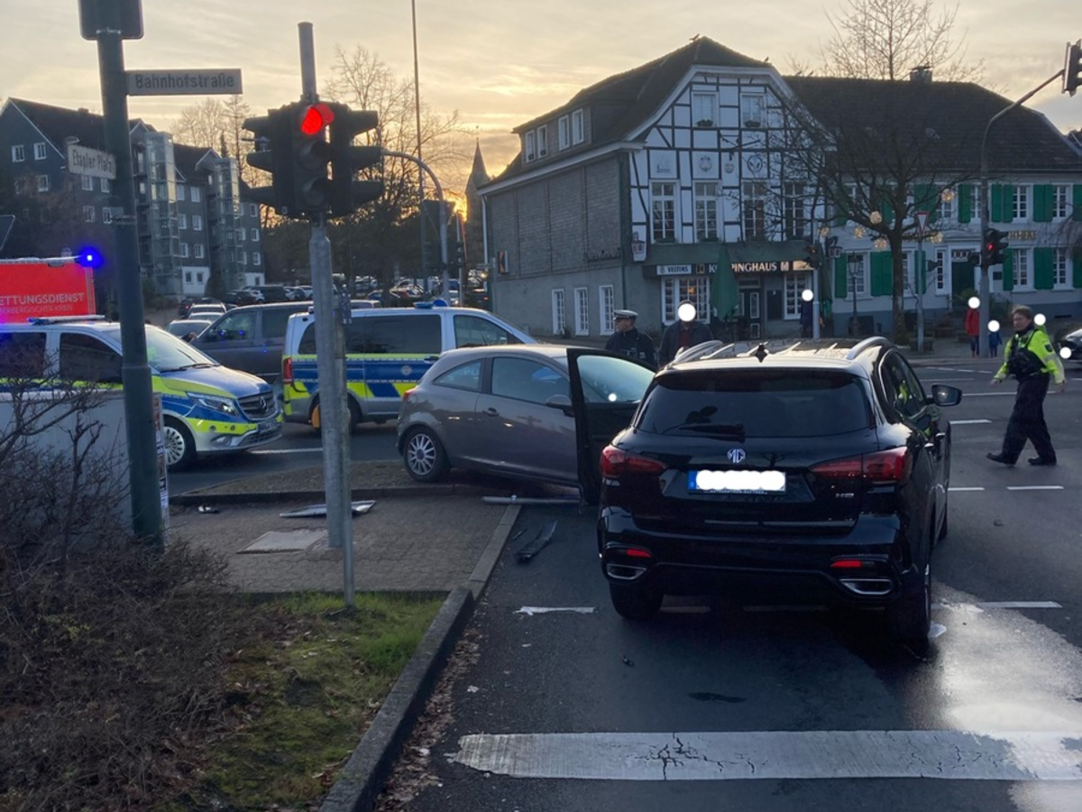 Hückeswagen - Am Mittwochnachmittag (18. Dezember) kam es in der Hückeswagener Innenstadt zu einem Verkehrsunfall, bei dem eine 84-jährige Autofahrerin leicht verletzt wurde. Die 84-jährige Hückeswagenerin war mit ihrem Opel auf der Goethestraße in Richtung Etapler Platz unterwegs. Als sie gegen 15:30 Uhr in den Kreuzungsbereich "Peterstraße/Bahnhofstraße/Etapler Platz/Goethestraße" einfuhr, kam es zum Zusammenstoß mit einem Streifenwagen, welcher sich auf der Anfahrt zu einem Einsatz befand und die Peterstraße in Richtung Bahnhofstraße befuhr. Im weiteren Verlauf kollidierte der Opel der 84-Jährigen dann mit dem Fahrzeug einer 50-jährigen Frau aus Remscheid, die mit ihrem Wagen an der Einmündung zur Straße "Etapler Platz" stand. Die Besatzung des Streifenwagens, sowie die Remscheiderin überstanden das Unfallgeschehen verletzungsfrei. Die 84-Jährige wurde durch einen Rettungswagen in ein Krankenhaus gebracht. Die Autos der 50- und 84-Jährigen waren nicht mehr fahrbereit und mussten abgeschleppt werden. Für die Unfallaufnahme wurde ein Verkehrsunfallaufnahmeteam eingesetzt. Die Ermittlungen zur Unfallursache dauern an.
