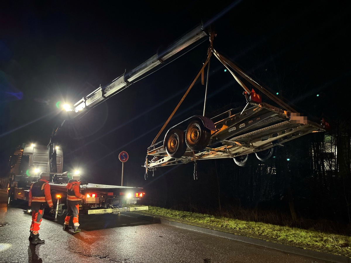 Die Mängel waren derart gravierend, dass eine gesicherte Fahrt zu einer Prüfstelle nicht möglich war. Daher musste der Anhänger durch ein Abschleppunternehmen geladen und zum TÜV gebracht werden.