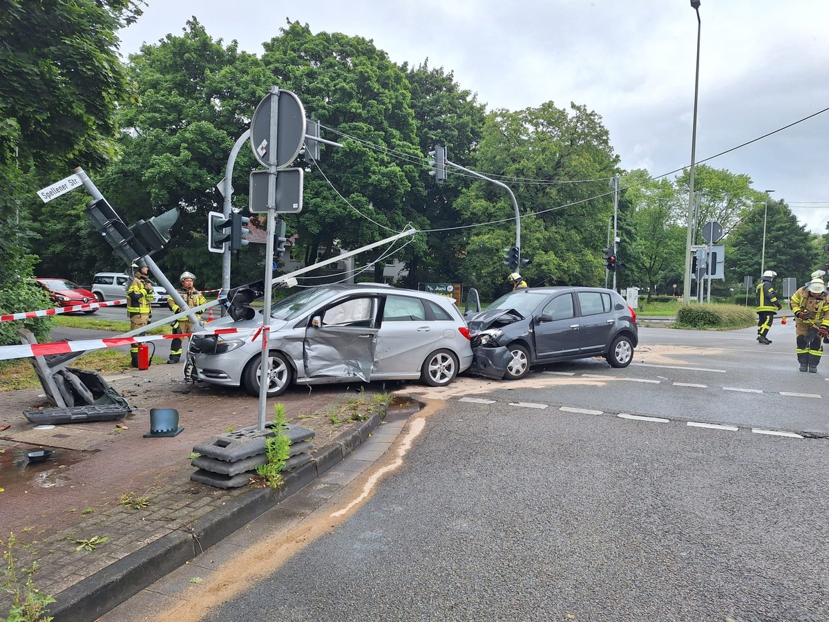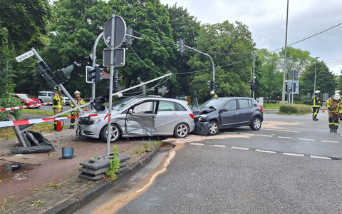 Voerde - Am heutigen Sonntagvormittag um 11:32 Uhr wurde die Einheit Friedrichsfeld der Feuerwehr Voerde zu einem Einsatz mit dem Stichwort "auslaufende Betriebsmittel" alarmiert. An der Kreuzung Hindenburgstraße (B8) Ecke Spellener Straße kam es zu einem Verkehrsunfall mit zwei beteiligten Pkw. Drei Personen konnten die Fahrzeuge vor Eintreffen der Feuerwehr selbstständig verlassen. Die Feuerwehr unterstützte den Rettungsdienst, sicherte die Einsatzstelle gegen den fließenden Verkehr und stellte den Brandschutz sicher. Außerdem wurden auslaufende Betriebsmittel abgestreut. Die betroffenen Personen wurden in umliegende Krankenhäuser gebracht. Bei dem Unfall wurde eine Ampelanlage erheblich beschädigt. Der zuständige Bereitschaftsdienst wurde zur technischen Sicherung und Instandsetzung der Anlage angefordert. In der Zeit der Unfallaufnahme durch die Polizei und bis zum Abtransport der verunfallten Pkw kam es zu Verkehrsbehinderungen im Bereich der Kreuzung. Während des laufenden Einsatzes meldete ein Passant eine bewusstlose Person im naheliegenden Park. Unverzüglich wurde die medizinische Erstversorgung durch die Feuerwehr eingeleitet und bis zum Eintreffen des Rettungsdienstes fortgeführt. Um 14:08 Uhr war der Einsatz für die Einheit Friedrichsfeld beendet.