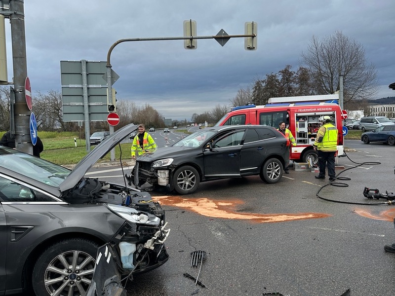 07.12.2025 - 14:12:58FW Weinheim: Wieder Verkehrsunfall auf der B38 Kreuzung Viernheimer Straße. Nach Angaben der Polizei wurde ein Autofahrer leicht verletzt. Der Sachschaden an den beteiligten Fahrzeugen schätzt die Polizei auf rund 100 000 Euro. Die Ampelanlage war zum Unfallzeitpunkt ausgefallen, die Kreuzung war durch Verkehrszeichen geregelt. Ein Fahrer missachtete nach derzeitigen Erkenntnissen im Kreuzungsbereich die Vorfahrt eines anderen Pkw. In der Folge kam es zunächst zu einer Kollision dieser beiden Fahrzeuge. Eines der Fahrzeuge wurde in den Gegenverkehr abgewiesen und prallte dort frontal auf einen verkehrsbedingt wartenden Ford S Max.