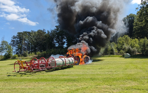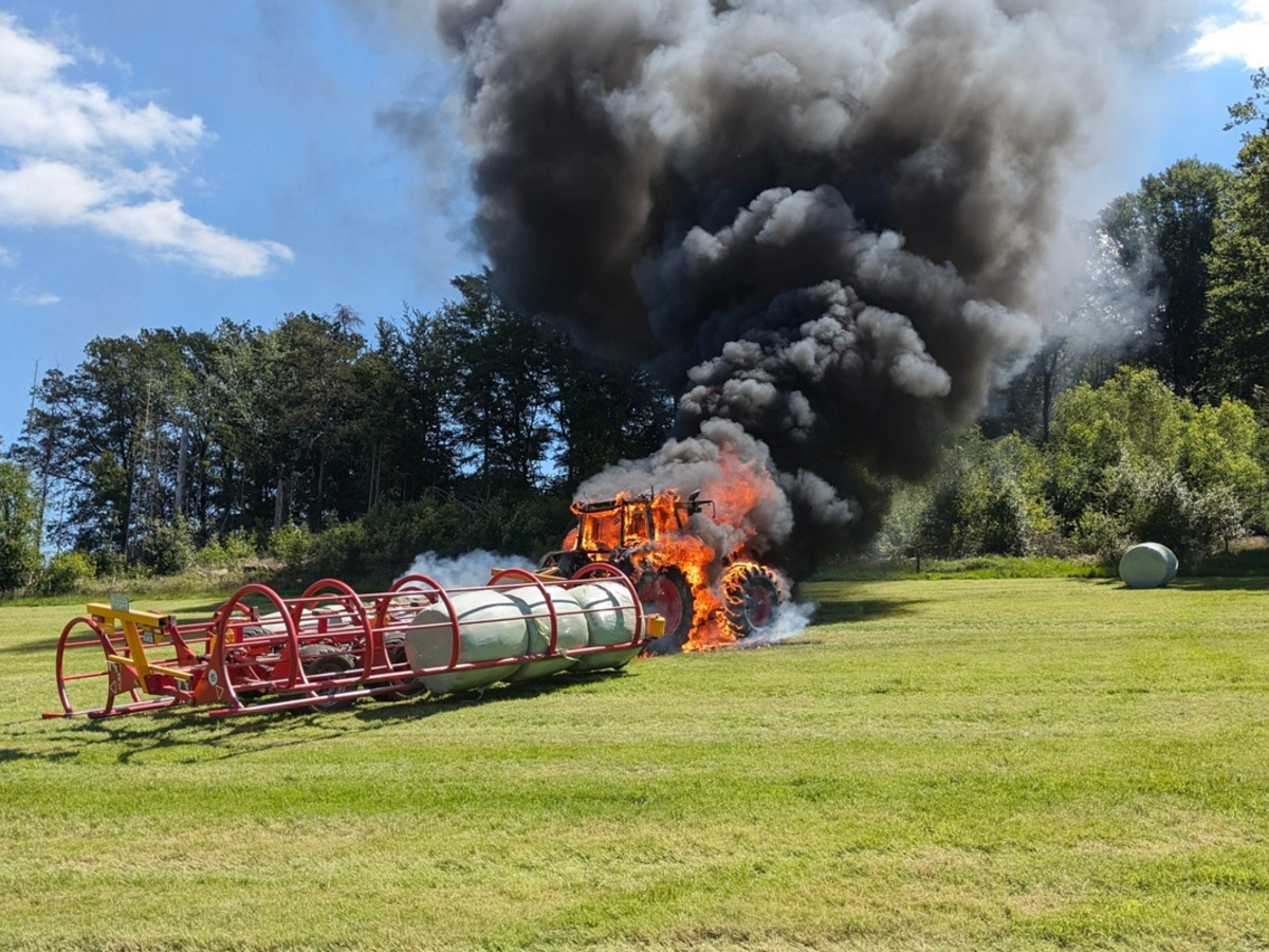 Aus bisher ungeklärter Ursache hatte der Traktor während der Feldarbeit Feuer gefangen, bei Eintreffen der ersten Kräfte stand das Fahrzeug bereits in Vollbrand. Umgehend wurden zwei C-Rohre durch zwei Trupps unter umluftunabhängigem Atemschutz vorgenommen, um das Feuer von beiden Seiten zu bekämpfen und ein Übergreifen auf den Anhänger und dessen Ladung zu verhindern.