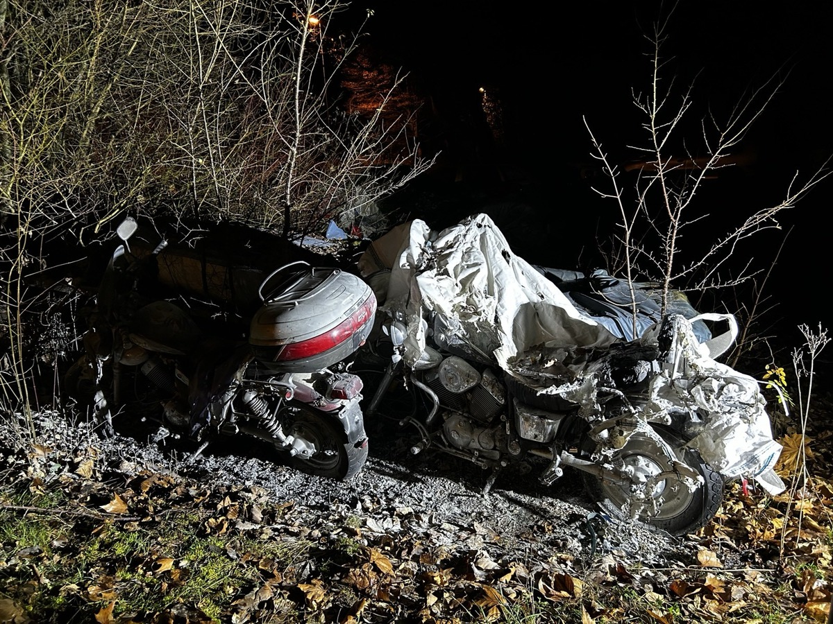 Zweibrücken - Unbekannte Täter setzten in der Nacht zu Mittwoch (19.11.2025) mehrere Fahrzeugabdeckplanen in Brand. Zwei Motorräder und ein Auto wurden dabei beschädigt. Gegen 1.30 Uhr wurde die Polizeiinspektion von einem Zeugen über ein Feuer auf einem Parkplatz hinter einem dortigen Mehrfamilienhaus informiert. Ein Anwohner konnte die Flammen mittels Feuerlöscher noch vor Eintreffen der Einsatzkräfte löschen. Insgesamt drei Schutzplanen wurden angezündet. Die Höhe des Sachschadens wird derzeit auf mindestens 2000 Euro geschätzt. Die Kriminalpolizei Pirmasens hat die Ermittlungen aufgenommen. Zeugen, die Hinweise geben können, werden gebeten sich mit der Kriminalpolizei Pirmasens unter der Telefonnummer 0631 369-15199 oder unter der E-Mail kipirmasens@polizei.rlp.de in Verbindung zu setzen. |krä