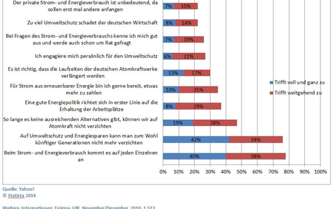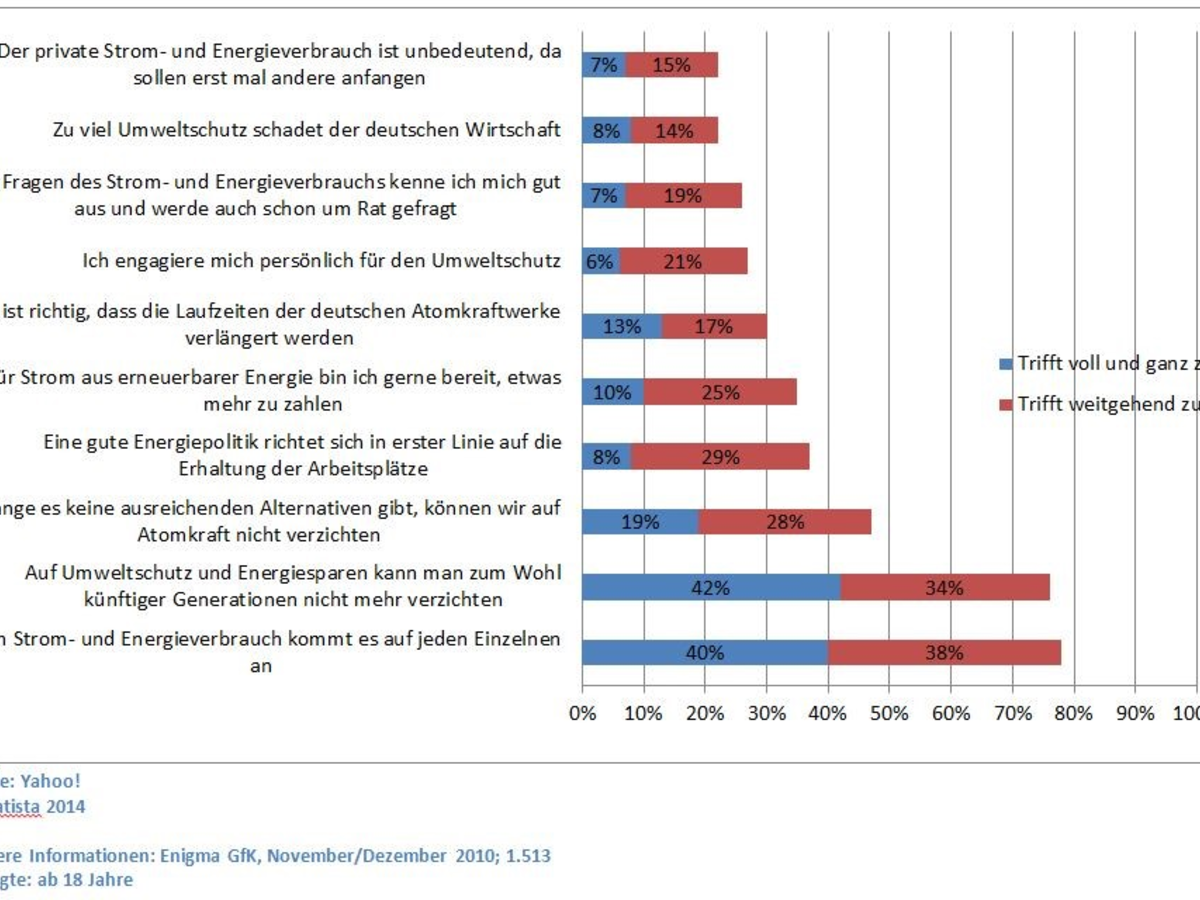 Eine Umfrage aus dem Jahr 2011 ergab, dass etwa 40 Prozent der Befragten es für wichtig halten, Strom und Energie zu sparen. Da Energiesparsamkeit mittlerweile aber nicht mehr nur mit dem Umweltschutz zusammenhängt, sondern auch mit den Kosten, die jeder einzelne für die verbrauchte Energie bezahlen muss, ist dies mittlerweile in vielen Haushalten zum Alltag geworden. Die Heizung wird beispielsweise nur so weit aufgedreht, dass der Raum eine Wohlfühltemperatur erreicht, aber nicht mehr überheizt ist. Die elektrischen Geräte sind bei Nichtgebrauch aus der Steckdose zu ziehen. Am sinnvollsten ist es, wenn beispielsweise eine Steckdosenleiste mit einem Power-Knopf angebracht wird. Beim Kauf von neuen Geräten sollten Kunden zudem auf die Energieeffizienzklasse achten, empfiehlt dieser Blog. Die Klasse A ist die energiesparsamste Variante. Nicht nur bei der Energie können Haushalte aber sparen. Wer zusätzlich noch Wasser spart, schützt die Umwelt noch ein bisschen mehr. Dies ist beispielsweise durch eine Spartaste an der Toilettenspülung möglich oder durch spezielle Duschköpfe, die Wasser vermischt mit Luft ausgeben - das Gefühl ist das Gleiche wie bei einem herkömmlichen Duschkopf, es wird aber weniger Wasser für einen Duschgang verbraucht. Vollbäder verbrauchen zudem etwa so viel Wasser wie zwei- bis dreimal Duschen - diese sollten also nur selten auf dem Tagesplan stehen. Wie sehr die Deutschen zu wichtigen Thesen aus den Bereichen Energie und Umwelt zustimmen, zeigt die folgende Statistik aus dem Jahre 2011: