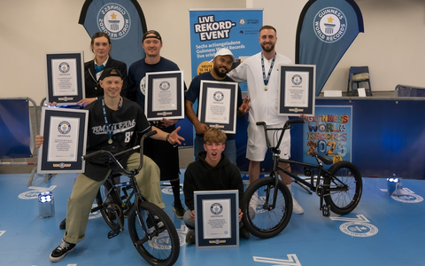 Auch René Mathussek, Freestyle-Fußballer aus Stuttgart, und der BMX-Profi Miguel-Emanuel Franzem aus Sindelfingen glänzten an diesem Tag mit beeindruckenden Leistungen. René stellte den Weltrekord für die meisten Fußballpässe zwischen Kopf und Fußsohle in einer Minute auf - stolze 50 Pässe. "Dieser Rekord bedeutet mir unendlich viel - er ist einer meiner Signature Moves", erklärte René sichtlich bewegt. "Ich möchte mit Freestyle und dem Rekord Kinder und Jugendliche inspirieren und ihnen zeigen, dass alles möglich ist, wenn man an sich glaubt." Miguel sicherte sich mit zehn Rückwärtssalti auf dem BMX ebenfalls einen Guinness-Titel und sprach aus, was alle Anwesenden und die fünf Athleten an diesem Tag erlebten: "Die unglaubliche Energie und Unterstützung des Publikums hat uns getragen und uns erst recht angespornt alles zu geben." René und Miguel umarmten nach den gelungenen Rekorden erst einmal ihre mitgereisten Eltern und Geschwister. Aber auch die anderen Rekordanwärter wurden von anwesenden Freunden und dutzenden frenetisch jubelnden jungen Fans hinter den Absperrungen der Eventfläche unterstützt.