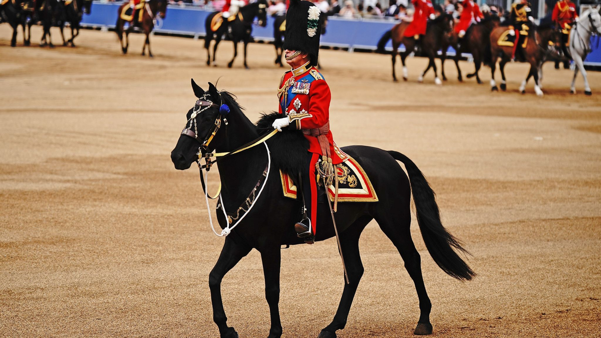Charles ritt mit tief ins Gesicht ragender Bärenfellmütze vor seinem Sohn William, seiner Schwester Prinzessin Anne (72) und seinem jüngsten Bruder Prinz Edward (59). Alle vier trugen Uniform.