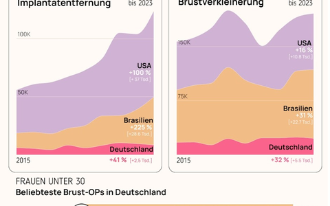 2023 wurden in Deutschland 8436 Operationen zur Entfernung von Brustimplantaten (Explantationen) durchgeführt, 41 Prozent mehr als noch 2015. Die Anzahl von Brustverkleinerungen ist im selben Zeitraum um 32 Prozent gestiegen. In den USA und Brasilien, die weltweit bekannt für ihre Schönheitsoperationen sind, ist der Trend sogar noch stärker: In den USA hat sich die Anzahl von Explantationen verdoppelt, in Brasilien mehr als verdreifacht.
