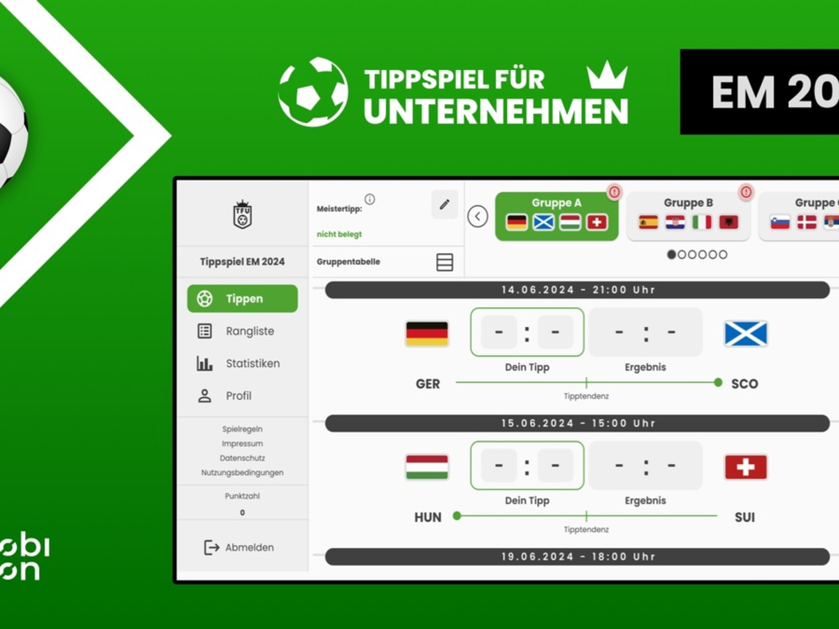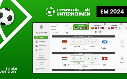 18.01.2024 - 08:30:00 | presseportal.deNoch gut sechs Monate bis zur Fußball EM 2024 und die Vorbereitungen für den Start am 14. Juni 2024 laufen bereits auf Hochtouren. Auch mobivention hat seine Tippspiel Whitelabel Lösung "Tippspiel für Unternehmen" für diesen Event vorbereitet. Es bietet Agenturen und Unternehmen die Möglichkeit, neue Kunden über dieses sportliche Großereignis an sich zu binden, wie zum Beispiel durch ein damit verbundenes Gewinnspiel für die Tippsieger.