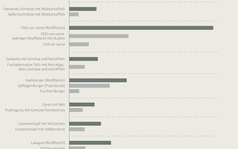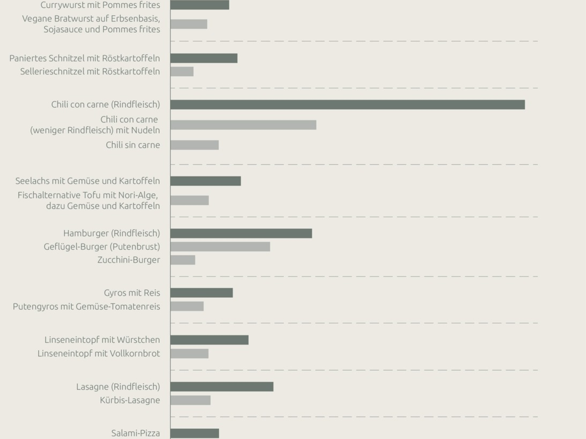 Laut einer Studie des Potsdam-Instituts für Klimafolgenforschung (PIK) könnte eine weltweite Umstellung der Ernährung hin zu gesünderen und nachhaltigeren Speiseplänen entscheidend dazu beitragen, die globale Erwärmung auf 1,5 Grad Celsius zu begrenzen. Greenado hat die Top 10 der deutschen Kantinengerichte unter die Lupe genommen und sowohl mit pflanzlichen als auch tierischen Alternativen unter CO2- und Ernährungsaspekten verglichen. Eines der Ergebnisse: Die CO2-Bilanz von Deutschlands Kantinenklassiker Currywurst mit Pommes frites sinkt um rund ein Drittel, wenn stattdessen eine pflanzliche "Bratwurst" auf dem Teller liegt. Das höchste CO2-Einsparpotenzial unter den zehn beliebtesten Gerichten hat Chili con carne: Wird es durch seine pflanzliche Alternative, Chili sin carne, ersetzt, spart das 86 Prozent der CO2-Emissionen ein.