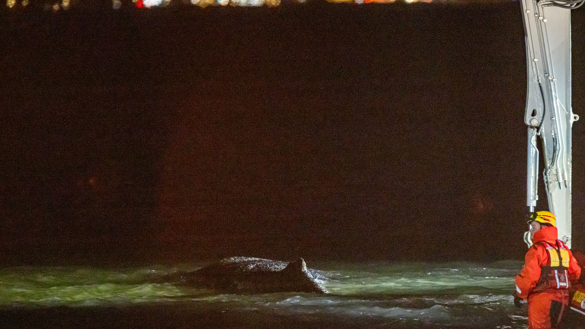 Der Buckelwal war Montagmorgen auf einer Sandbank entdeckt worden. Am Dienstag war ein Rettungsversuch mit einem kleinen Saugbagger gescheitert.