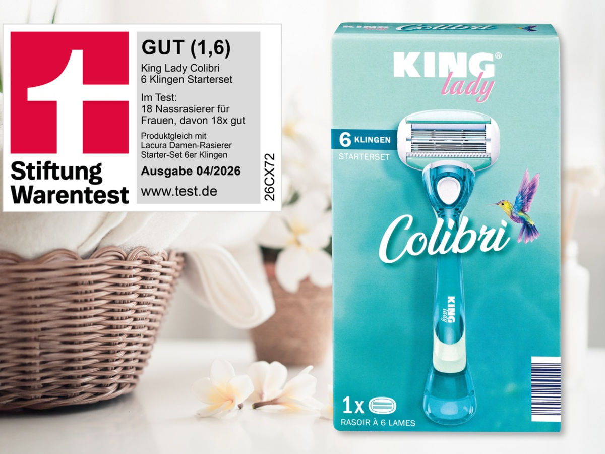 Wie gut sind Damen-Nassrasierer? Dieser Frage ist STIFTUNG WARENTEST in ihrer aktuellen Ausgabe (04/2026) nachgegangen und hat insgesamt 18 Produkte - darunter 14 Systemrasierer und 4 Einwegrasierer - aus Discountern, Drogerien und von Markenherstellern miteinander verglichen. Mit dabei: das KING LADY Colibri 6 Klingen Starterset von NORMA.