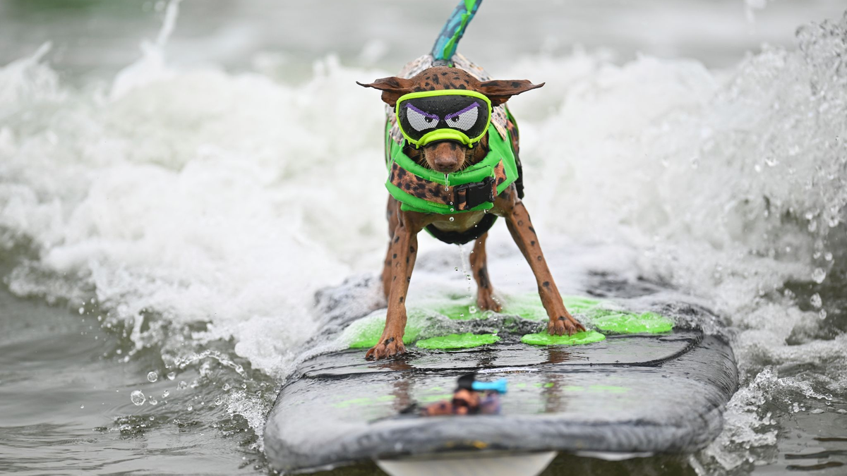 04.08.2024 - 11:57:26 | dpa.deStatt ums Stöckchen holen geht es bei diesem Hunde-Wettbewerb ums Surfen auf vier Pfoten: Mehrere Vierbeiner haben beim diesjährigen Hunde-Surf-Wettbewerb an einem kalifornischen Strand Stehvermögen und Stil bewiesen, wie der Veranstalter und mehrere US-Medien berichteten. Mit Schwimmwesten und kreativen Kostümen düsten die Tiere demnach auf ihren Brettern über die Wellen.