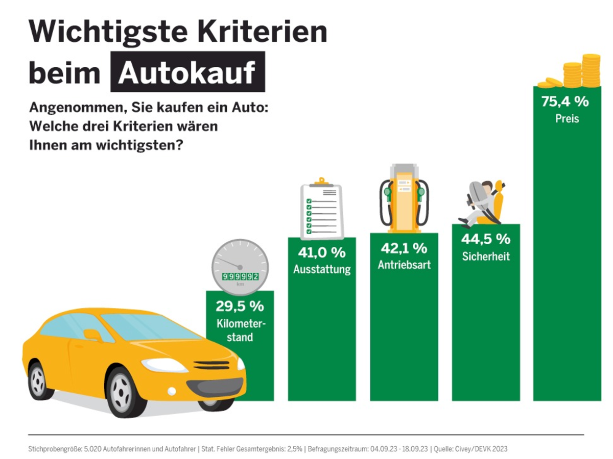 07.11.2023 - 10:05:00 | presseportal.deDer Anteil der E-Autos bei den Neuzulassungen ist zuletzt deutlich gesunken, nachdem die staatliche Förderung für Dienstwagen mit Elektromotor Ende August ausgelaufen ist. So wurden laut Kraftfahr-Bundesamt im September rund 29 Prozent weniger Stromer zugelassen als noch im Vormonat. Dass der Preis beim Autokauf jedoch entscheidend ist, bestätigt die repräsentative Umfrage der DEVK: Für 75,4 Prozent der Befragten ist er das wichtigste Kriterium. Mit großem Abstand folgen Aspekte wie Sicherheit (44,5 Prozent), Antriebsart (42,1 Prozent) und Ausstattung (4 Prozent).